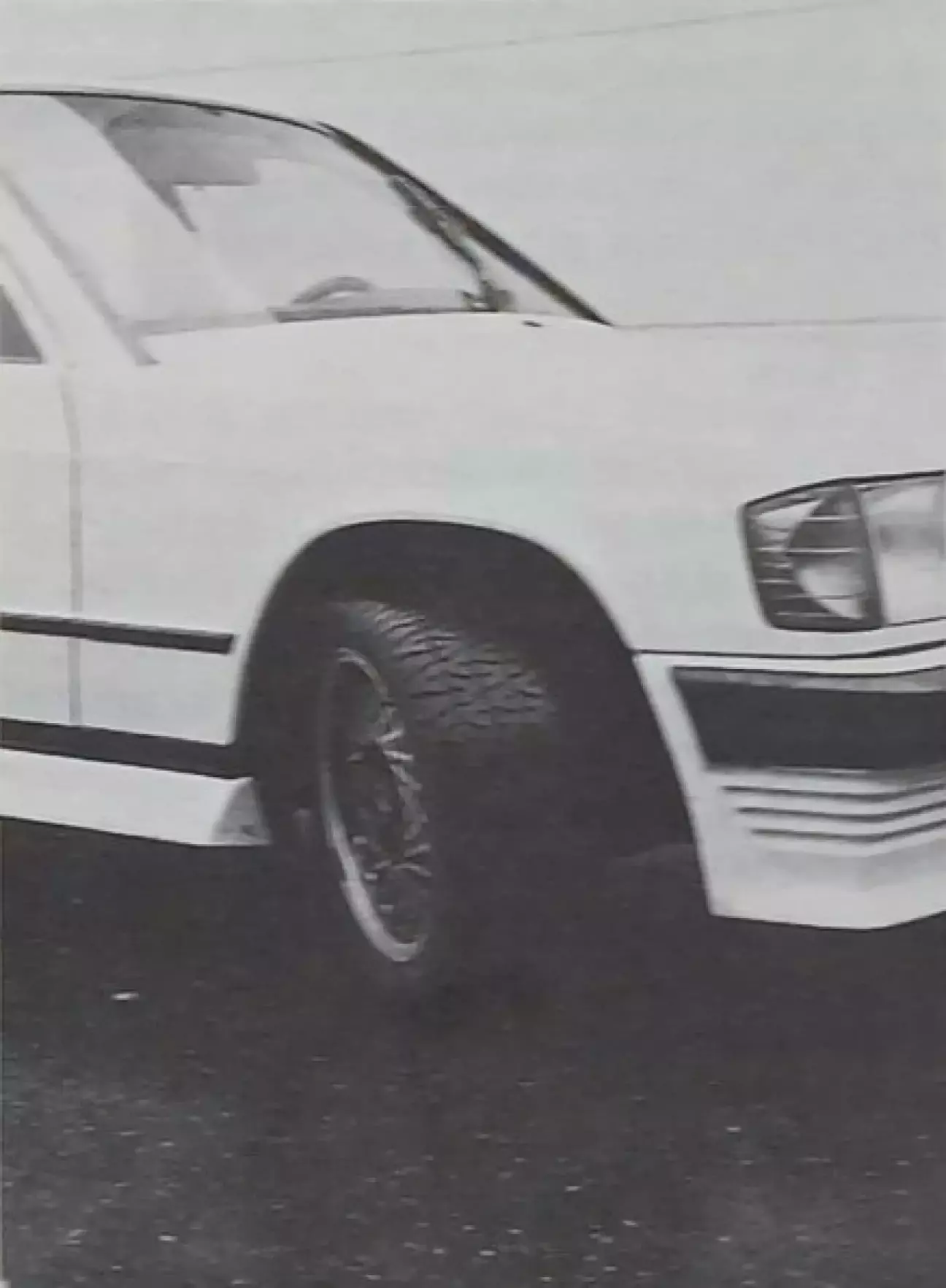 Диски той же размерности (в данном случае Rial) выбраны и для версии Turbo Technicar, на которые надеты покрышки Goodrich Comp TA 205/50 VR 15 — комплект, который нам не терпится испытать. Интерьер — как у 190E, и примечателен отсутствием каких-либо дополнительных приборов. Что касается внешнего лоска, то он приближен к 16-клапаннику с помощью обвеса Technicar: передний спойлер, боковые пороги, накладка на задний бампер и спойлер на крышке багажника, менее массивный, чем у 2.3-16. Весь этот комплект ставится в штатные места Mercedes и требует лишь небольшого дополнительного крепежа. Омологированный и распространяемый через официальную сеть Mercedes в Голландии, он стоит 42 000 франков без установки и НДС. Он подкупает качеством и простотой монтажа, но не может претендовать на аэродинамическую эффективность элементов, установленных на оригинале. Напоследок отметим, что Technicar также предлагает декоративные полосы и графику на борта, призванные сделать ваш 190 еще более агрессивным или менее строгим. Но о вкусах не спорят...