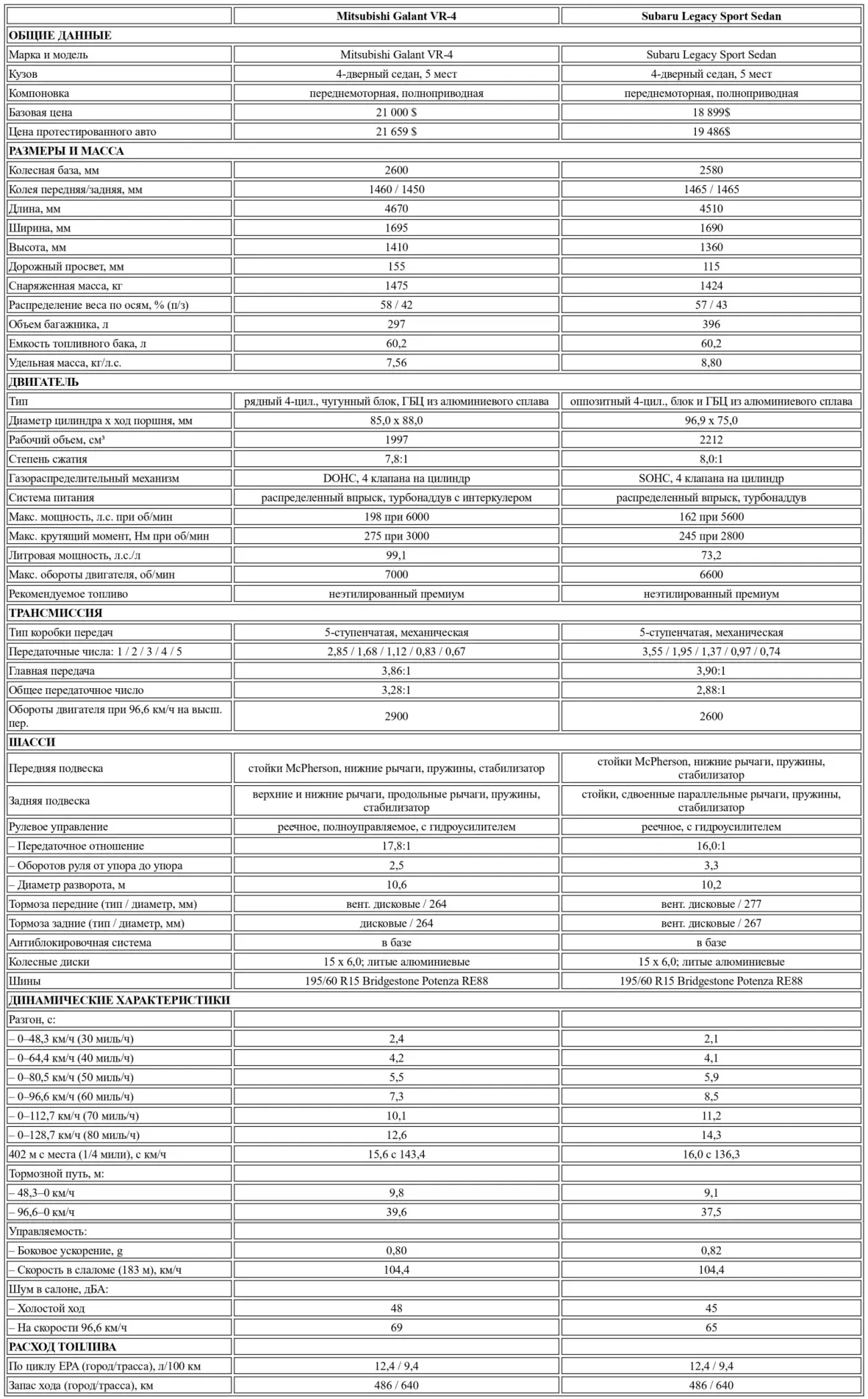 В конечном счете, любой из них — очень приятное пополнение в семейном гараже. И это не потребует огромных затрат: наш Galant VR-4 имел базовую цену 21 000 долларов (итоговая цена 21 659 долларов), а Legacy Sport Sedan стартовала с 18 899 долларов (19 486 долларов за протестированную версию). Технологии для каждого. Любая из этих машин с улыбкой выполнит практически все, что вы от нее потребуете, в любую погоду и при этом не разорит вас. Что тут может не понравиться?