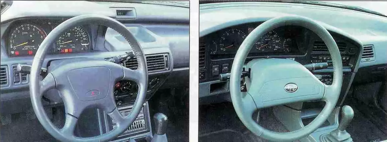 Обладая значительно большей мощностью, Galant VR-4 оказался более чем на секунду быстрее в разгоне до 96,6 км/ч: 7,3 секунды против 8,5 у Legacy, хотя Subaru по абсолютной шкале все равно остается довольно резвой. При торможении со скорости 96,6 км/ч результаты были близки: Legacy остановилась через 37,5 метра, Galant — через 39,6 метра. Учитывая наличие АБС и одинаковых шин у обеих машин, а также меньший вес Legacy, такая разница кажется вполне логичной. Показатели управляемости также оказались близкими и достойными. На боковой перегрузке Legacy зафиксировала 0,82 g на круговой площадке, а Galant VR-4 — 0,80 g. В слаломе результаты совпали — 104,4 км/ч. У них даже одинаковые паспортные показатели расхода топлива по методике EPA: 12,4 л на 100 км в городе и 9,4 л на 100 км на трассе. При одинаковых топливных баках объемом 60,2 литра это означает идентичный запас хода.