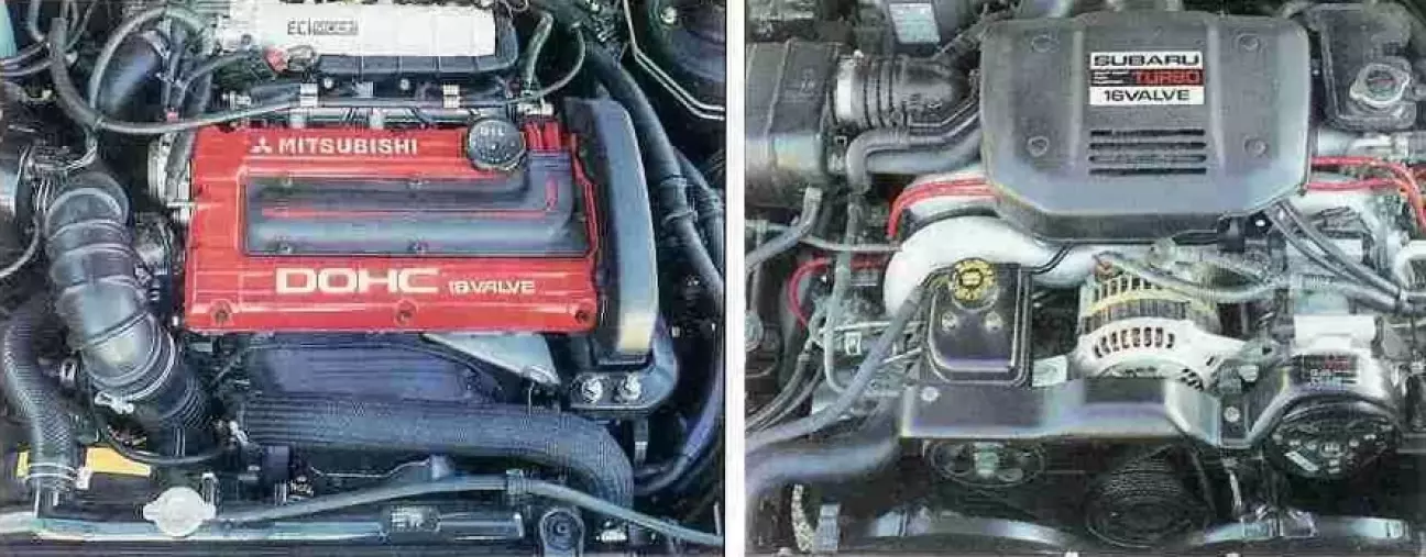 Различия становятся очевидными, стоит лишь открыть капот. Под капотом Legacy Sport Sedan открывается привычная для Subaru картина: горизонтально-оппозитная четверка. Этот 2,2-литровый агрегат с компоновкой SOHC, имеющий по четыре клапана на цилиндр и турбокомпрессор с давлением наддува 0,55 бара, развивает 162 л.с. при 5600 об/мин. Двигатель Galant VR-4, заимствованный у Eclipse GSX, представляет собой 2-литровую рядную четверку DOHC с 16 клапанами, которая выдает 198 л.с. при 6000 об/мин — при рабочем объеме на 215 см³ меньше, чем у Legacy, он мощнее на 36 л.с. Двигатель Mitsubishi более современен по конструкции, и, используя интеркулер (которого нет у Legacy) и максимальное давление наддува 0,77 бара, его инженеры по максимуму реализуют заложенный потенциал. Оба наших тестовых автомобиля были оснащены пятиступенчатыми механическими коробками передач. Для Galant VR-4 это единственный выбор, в то время как Legacy также доступна с опциональным четырехступенчатым автоматом.