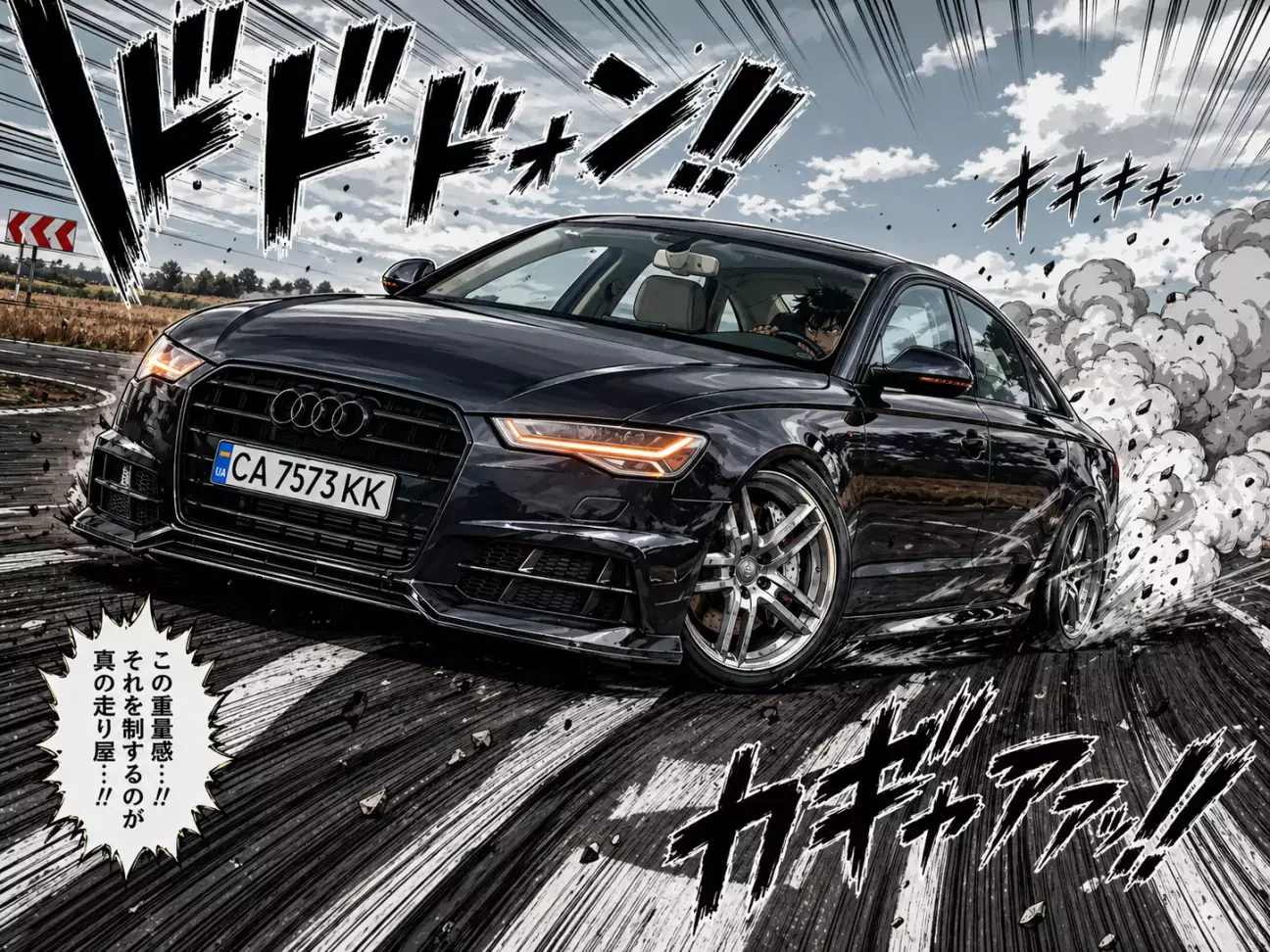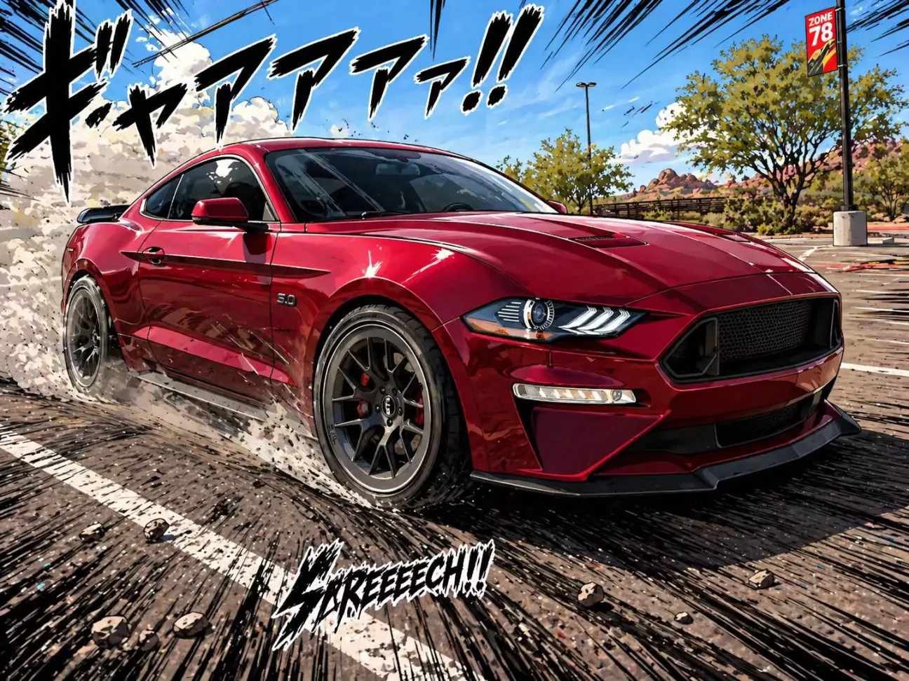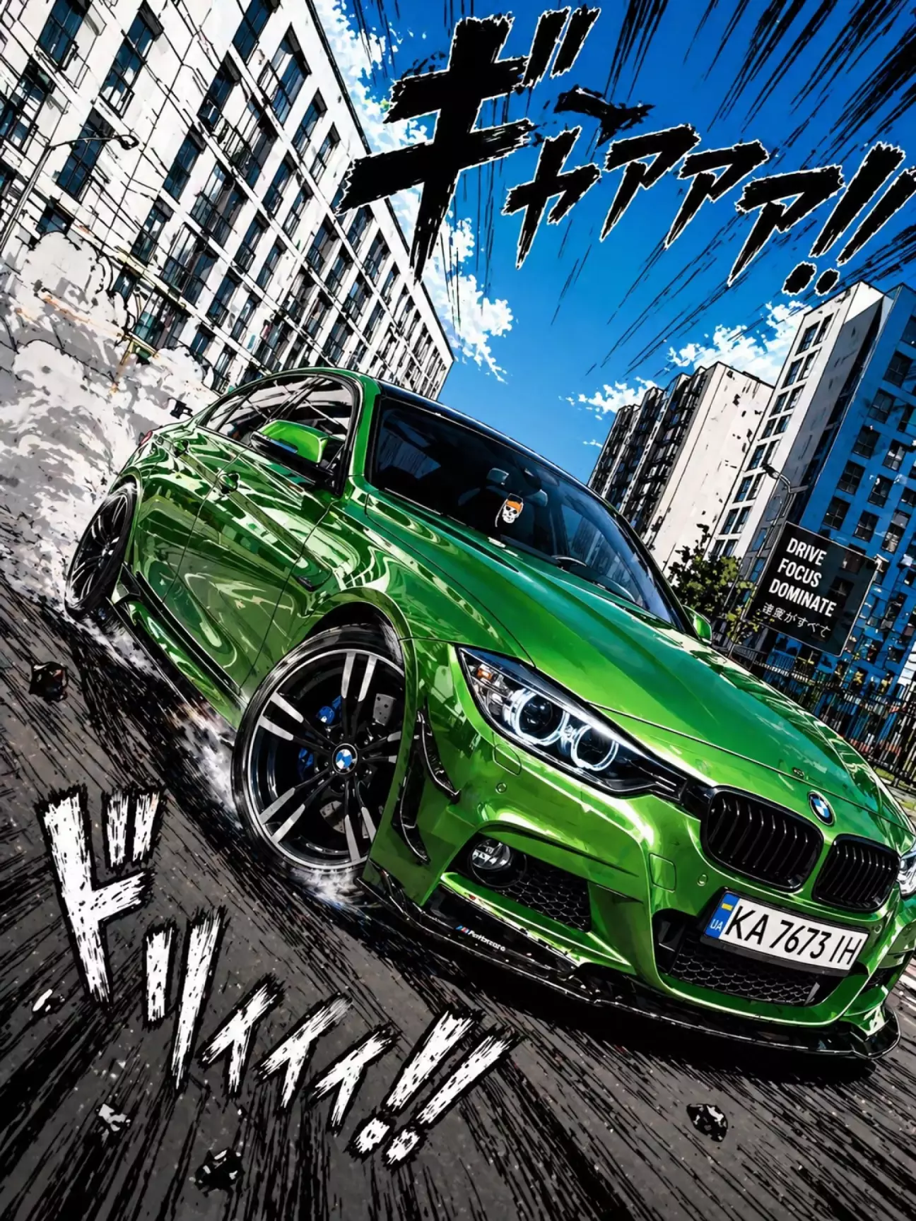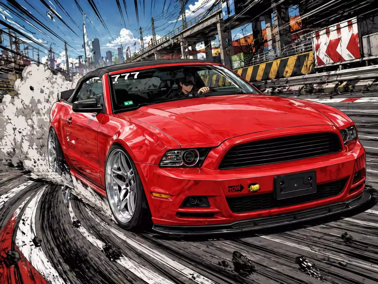 the vehicle is highly detailed with visible mechanical precision: wide tires, deep rims, brake discs, vents, body kit, sharp reflections defined by clean color blocks and ink lines motion is exaggerated with dense speed lines, tire smoke trails in soft grey tones, asphalt debris, skid marks, and warped perspective lines bending around the car environment features [ENVIRONMENT DETAILS], rendered with simplified color blocking, strong perspective, and layered depth reacting to the car’s movement rendering uses bold black ink contour lines, varied line weight, flat color fills with minimal gradients, subtle cel shading, no painterly blending, no photorealism lighting is stylized with sharp highlights and shadow shapes, using color contrast instead of realistic lighting composition is aggressive and diagonal, with strong forward momentum, visual tension, and cinematic framing