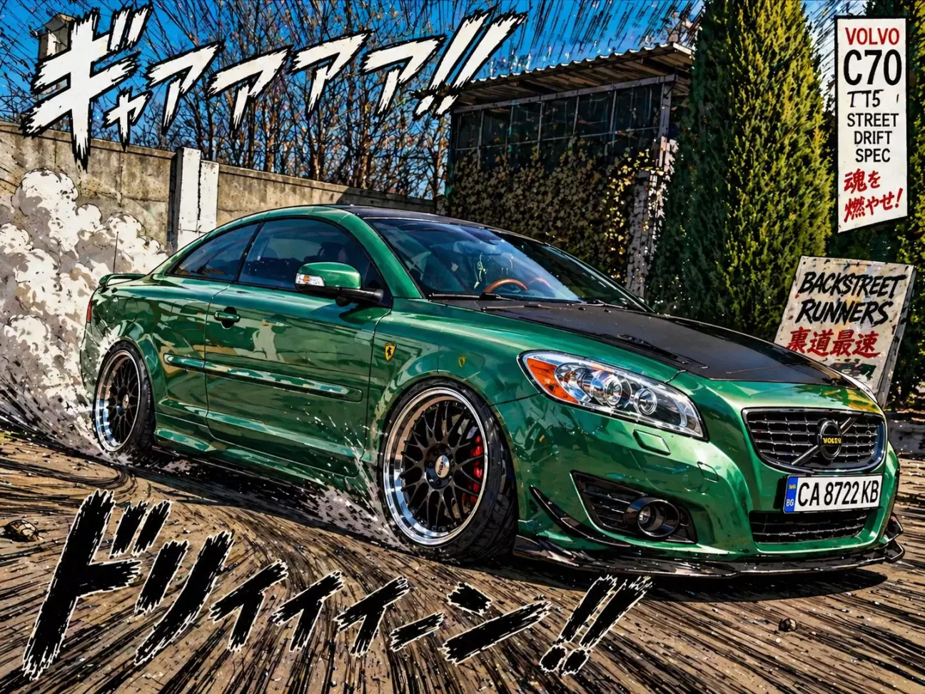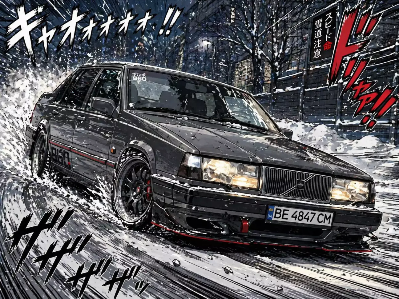 High-energy color manga-style street racing illustration of a modified [CAR MODEL] in [PRIMARY COLOR] with [ACCENT COLOR], drifting at high speed through [SCENERY], captured from an extreme low angle, front three-quarter perspective, car dominating the frame