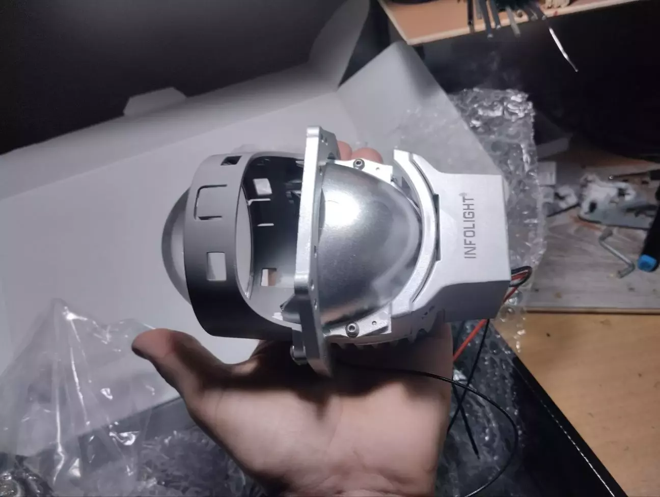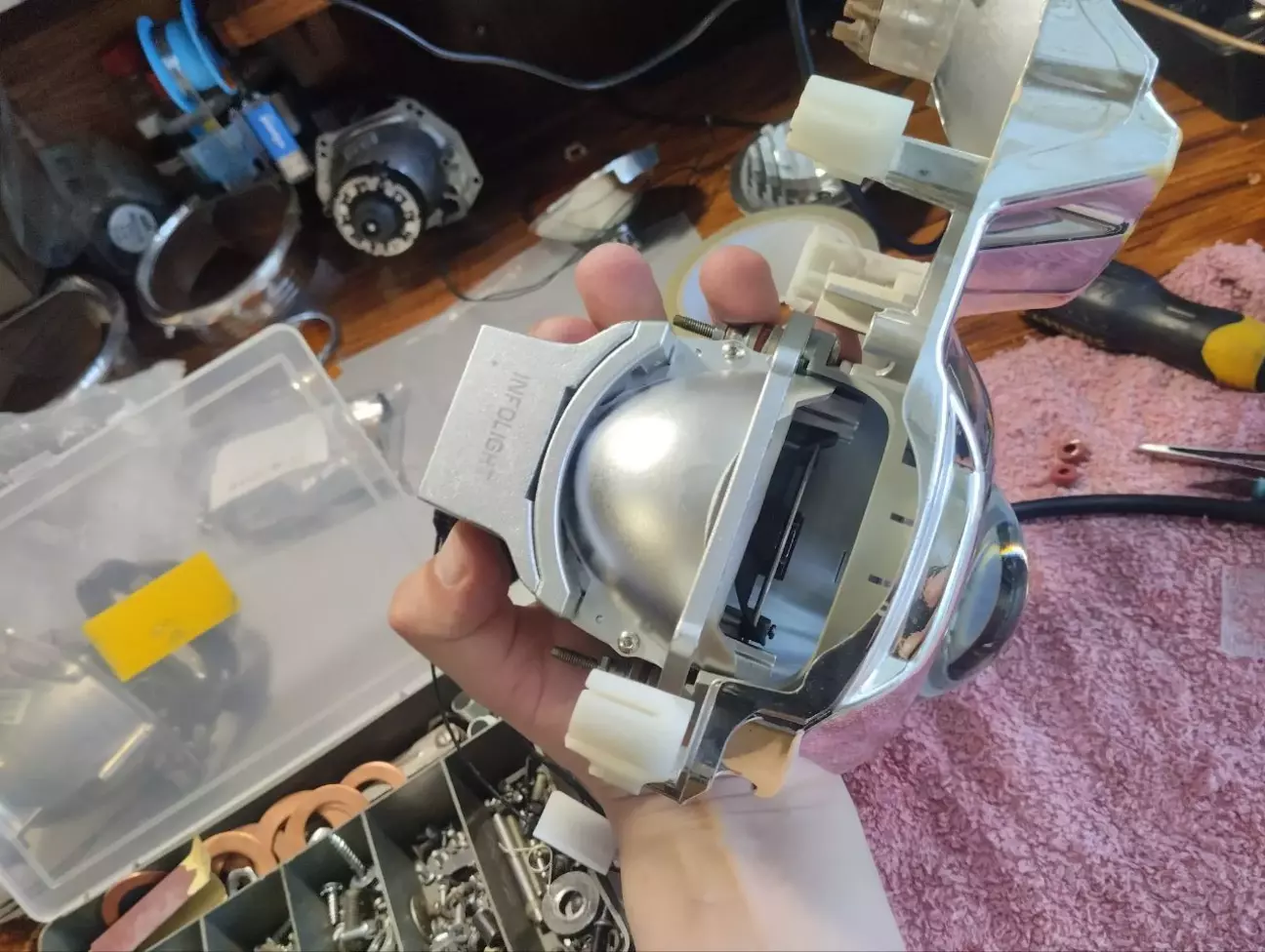 Перемиті були і висушені корпуси фар та різні дрібні елементи. Не розумію як люди збирають фари брудними,тут вимиті,продуті і то пилинка де не де потрапить
