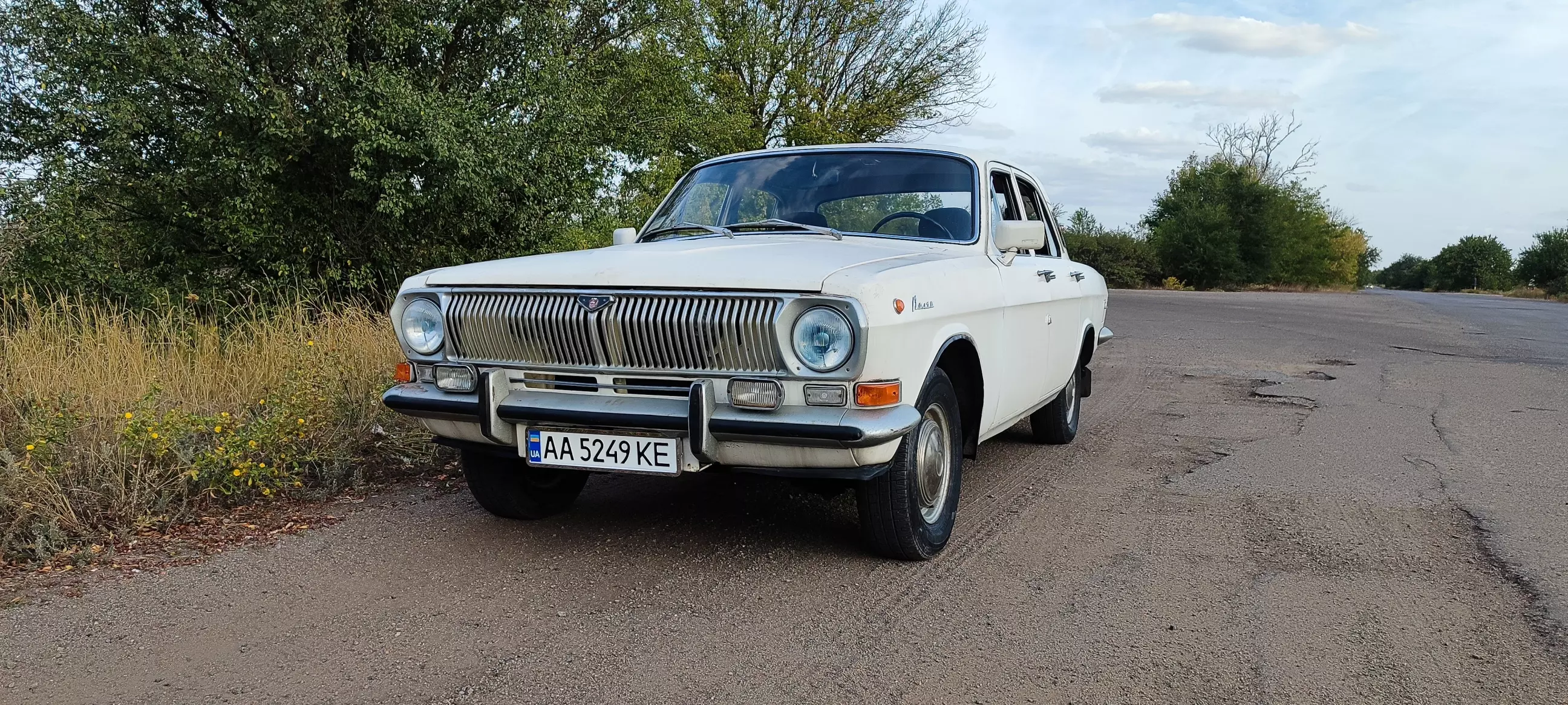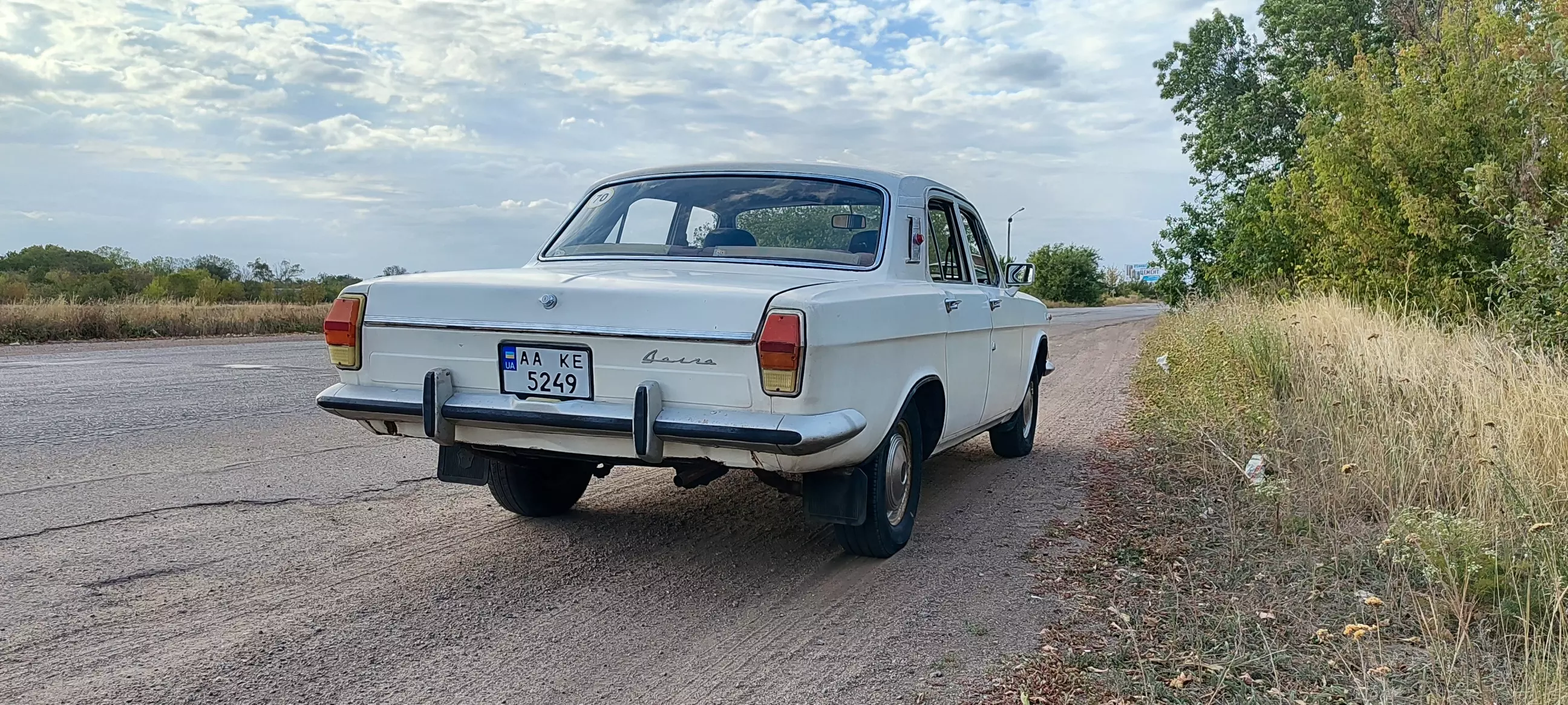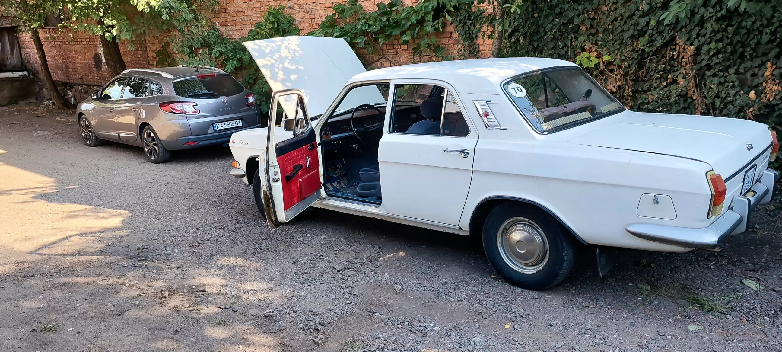 Приїхали, іде дощ , дме вітер, "представник" продавця вигнав її з двору, Вогла вся брудна, не зрозуміло якого кольору, чи то білий чи то бежевий. Я починаю огляд, відкриваю водійські двері, сідаю і... Привіт капсула часу. Стан салону ідеальний, торпеда без жодної тріщинки, дверні карти червоного кольору в і-де-а-лі, всі перемикачі клацають наче нові, радіо рідне а275э, на підлозі карпет, а на карпеті саморобні килимки з ковроліну. Так, сидіння не рідні, але досить зручні, та в нормальному стані. Ок. Іду дивитися що там під капотом, а там, ріднесенький змз 2401, з електронним запалюванням з датчиком Холла і комутатором від ВАЗ 2108, встановлений карбюратор ДААЗ (рідний к126г лежав в багажнику), а на ньому черепашка від москаля 2141 та нульовим повітряним фільтром, це із ніштяків, а все решта як в звичайній 24ці, кінчений гідровакуум, "п'ятсот літровий" стакан масляного фільтра, роздутий та позтрісканий верхній патрубок радіатора і тд. Повертаюся в салон, заводжу мотор, так як він був ще теплий, завівся він з пів тичка. Одразу погляд на температуру , 60 градусів, тиск оливи на холостих 1.5кг, даю газу, піднімається до 4кг - Супер! Мотор живий. Зчеплення, передача, все чітко, кпп 4х ступка, гальма як і мають бути з гідровакуумом - дубові))) Далі зовнішній огляд, лакофарбове геть ніяке, все в тріщинах та відслоюваннях фарби таке враження що її залили білою фарбою просто на стару рідну, на порогах не зрозумілі темно рижі потоки схожі на іржу (як потім виявилося, то потікший мовіль). Оглядаю колеса, в комплекті тільки 3 оригінальних ковпака, резина стоїть радянська ІД 220, вся потріскана, але з майже новим протектором. Розмір 205/70 14, рідна запаска в багажнику 180та. Лізу під дно, вона вся задута мовілем. Одразу кинулися в очі старі потріскані гальмівні шланги. Рессори змащені та замотані в тряпчану ізолену. По дну гнилі не знайшов взагалі. На дверях та крилах також все ціле, а от бампера, хоч і рівні і не покручені, та хром зафарбований молотковою фарбою, така ж історія і з радіаторною решіткою (як потім розказав власник, хром на них просто позлізав, і він їх зачухав наждачкою та пофарбував). Короче кажучи за машиною доглядали, і дуууже мало їздили. Тому 60 (а може і 160)))тис км здається на її реальний пробіг. По кузову вона вся рівна, зазори більш менш однакові, а головне, майже всі атрибути чистої 2ї серії були присутні, шильдики на крилах та кормі, ікласті бампери, габарити на погонах, навіть виштамповка під квадратний номер на задній панелі (доречі номер стояв нового зразка, але дірки в панелі старий власник не сверлив, він зробив перехідник і вкрутив номер в рідні отвори, за що йому велика шана та подяка), не рідні тільки зовнішні дзеркала і дзеркало в салоні пластикове, а не металеве хромоване.