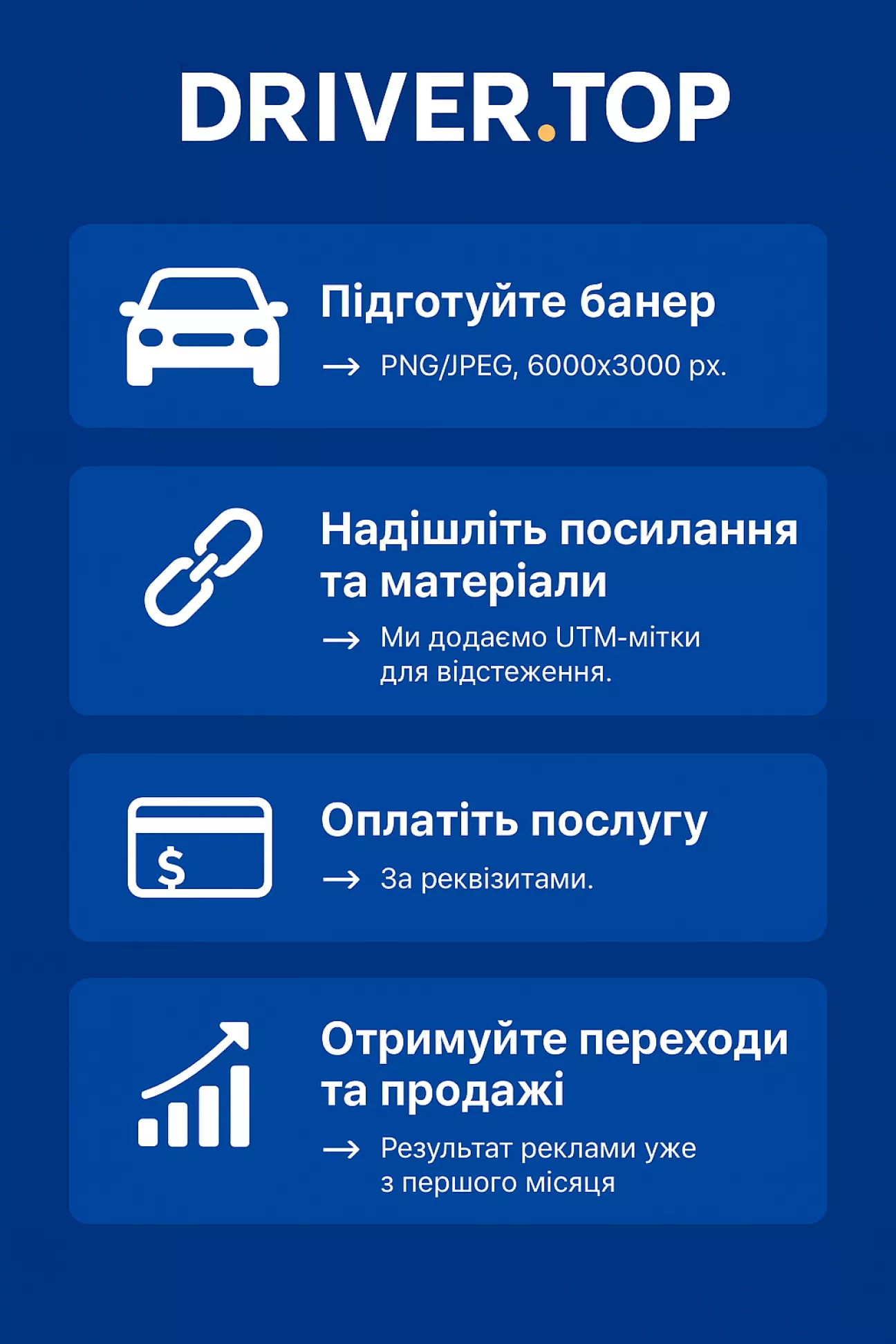 Банерна реклама — це зручний і помітний інструмент просування, який дозволяє залучати нових клієнтів безпосередньо з ресурсу DRIVER.TOP.