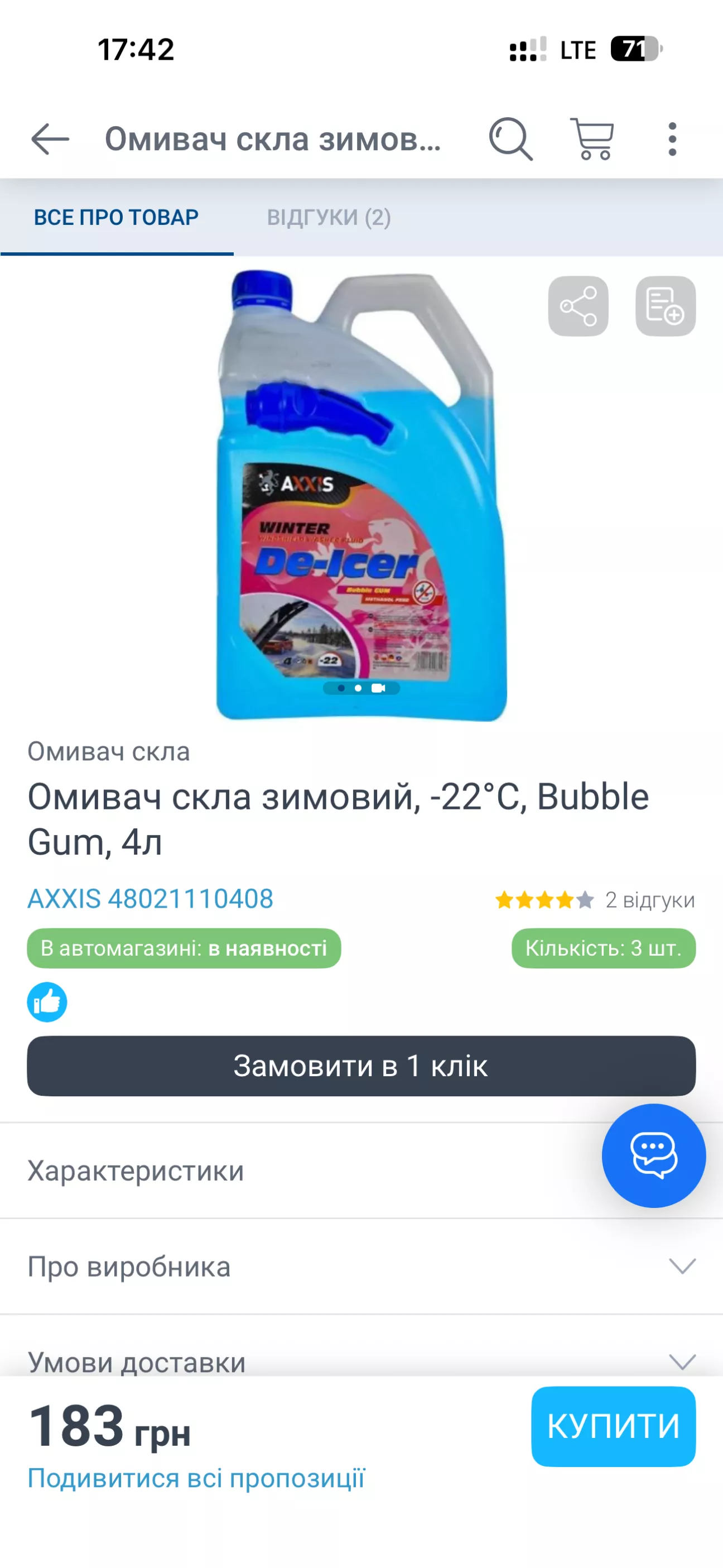 Доброго вечора. Панове підкажіть хто якою омивайкою користується в зимку? Я наприклад раніше купував на заправках і постійно з якимось запахом тай ціни кусаються. А в цьому році купив за 140 грн 4літра на Exist.ua, De-Icer із запахом баблгам, рекомендую дешево і не воняє.