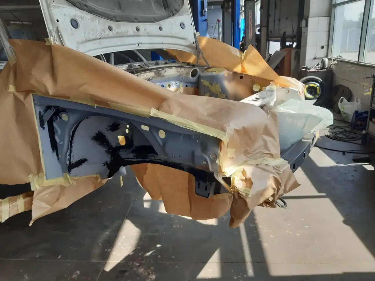 Поступово але повільно рухаємось вперед) Прийшов час нанести бітумно- каучукове покриття (в народі Баран))). Не бажані місця - облеїв від не потрібного напилу, отвори з різьбою - закрив болтиками. Одже багато писати не буду - спостерігайте)