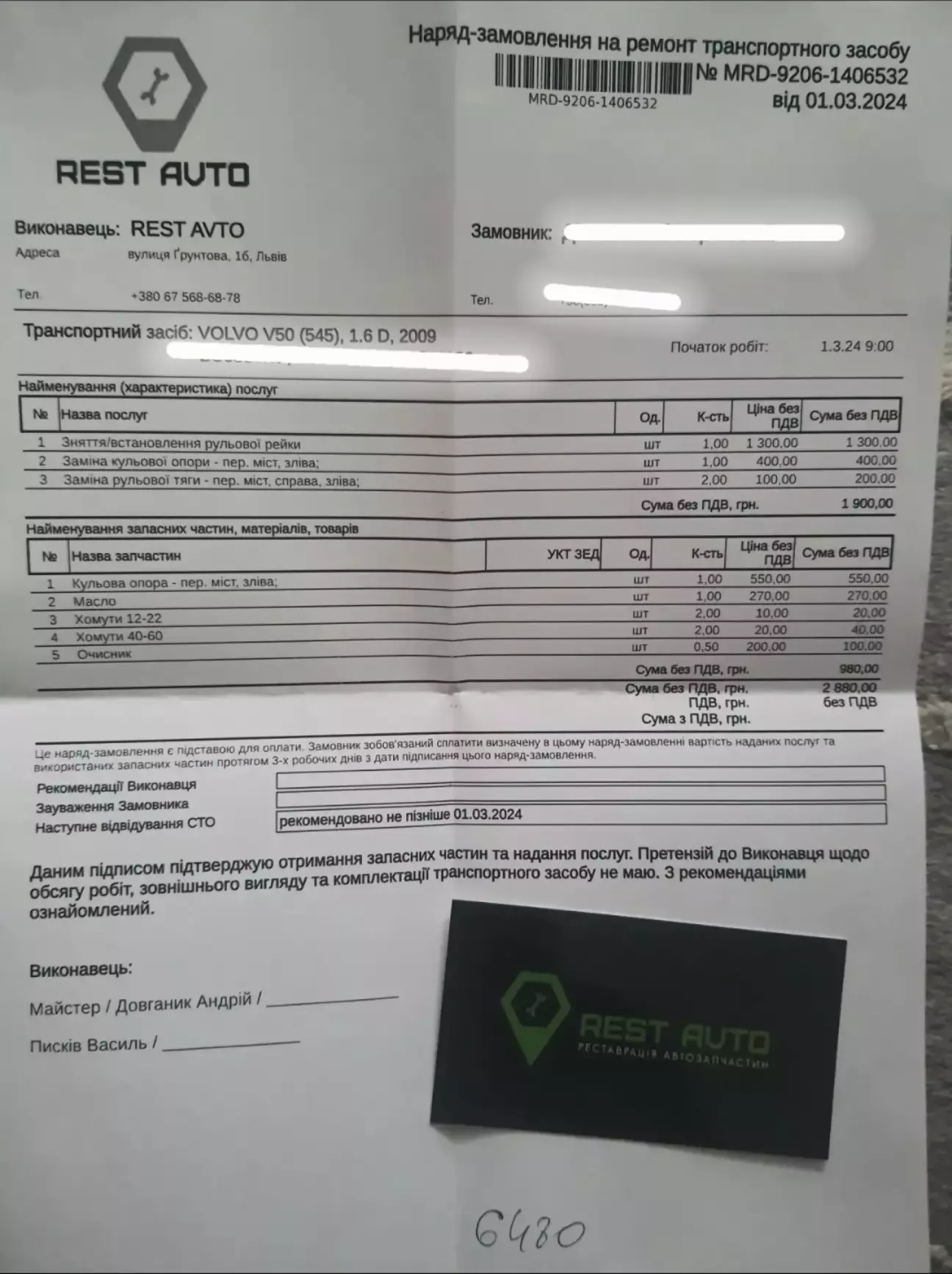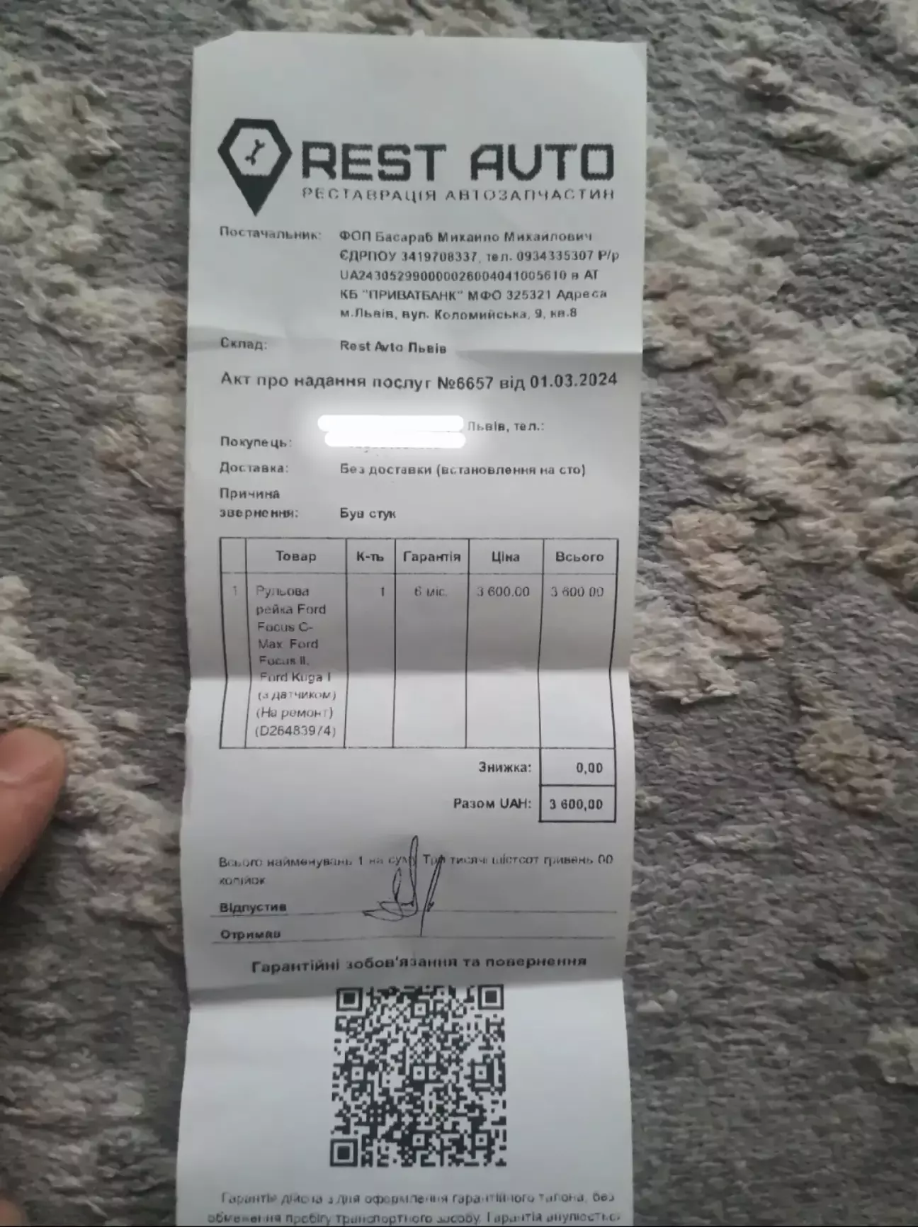Через тиждень залишаю машину на ремонт рейки. Передзвонили менеджери, повідомили, що крім рейки потрібно замінити обидві рульові тяги, бо одна рипить, інша стукає. Попутно я ще попросив замінити кульову опору. Класно, що в них є опція замовлення і доставки запчастин.