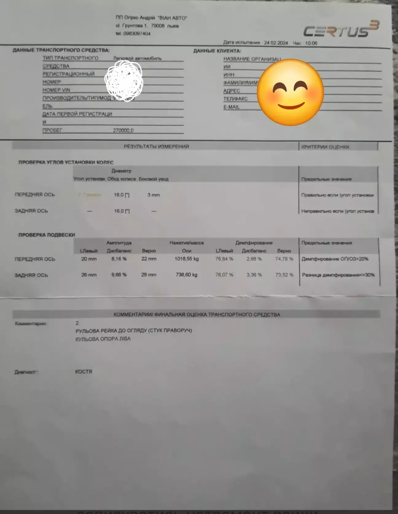 Ну що ж, перший ремонт був не дуже вдалий. Мою оригінальну рейку замінили, поставили якусь відреставровану, яка успішно за декілька днів почала знову стукати. Я сам винуватий, що не придирався до зайвих звуків і не їздив на діагностику. Тим більше, зимою посторонніх шумів не було. З потеплінням крім стукання з'явився ще й скрип. Гарантія на роботу з попереднього сервісу закінчилась, тож вирішив робити все з початку, але на іншому сервісі. Щоб точно переконатись, першим ділом їду на вібростенд.