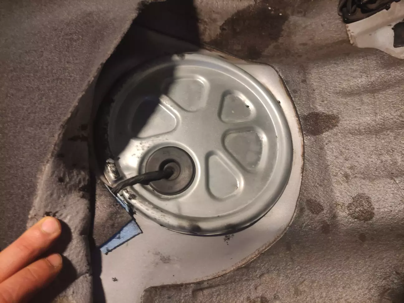 Акуратно піддіваючи кришку пласкою викруткою стараємося одночасно відділяти герметик від підлоги, щоб він по максимуму залишився на кришці. Можна допомагати собі відділяти герметик пластиковою карткою, щоб не пошкодити фарбу на кузові. Операція нудна і брудна, але що поробиш...