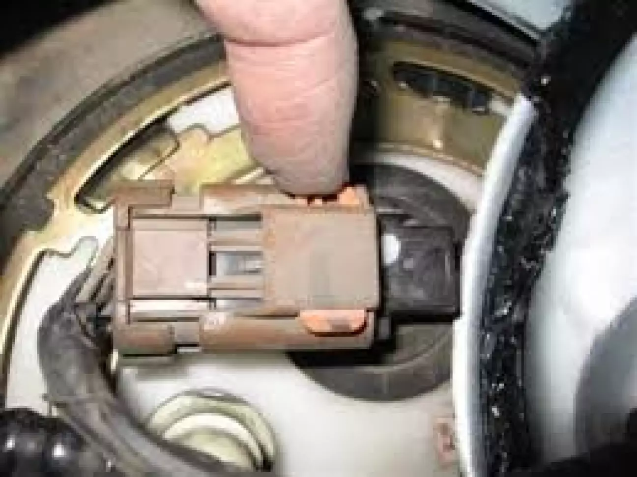 Наступним кроком відкручуємо шайбу-фіксатор модуля до бензобака. Провертати її потрібно проти годинникової стрілки. До яких пір провертати, думаю стане зрозуміло по співпадінню виступів бензобака і прорізей на шайбі.