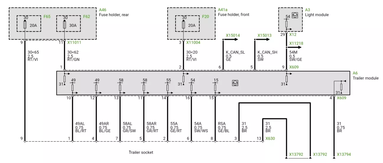 Пін 1 - живлення модуля прицепа. Під'єднується до заднього блоку запобіжників А46 фішки х11011 пін 11. На схемі має позначення 30<62 2.5 (RT/GN), що означає 30 контакт (постійний плюс) взятий з запобіжника 62, 2.5 мм.квадратних, червоний з зеленою смужкою.