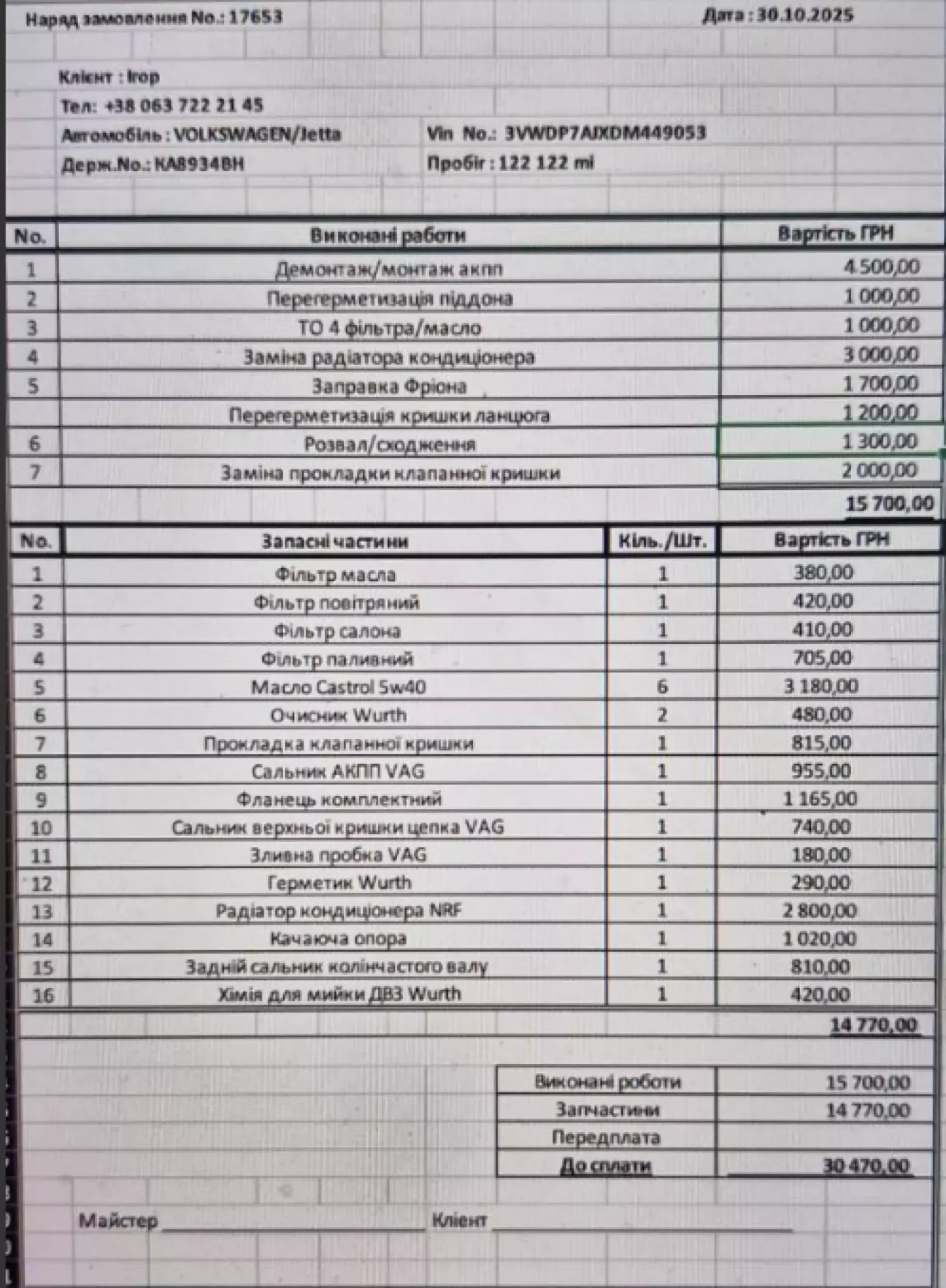 Замена масла двиг: 5w-30 4л +1л+1л+1л (6,5л влезло + 0,5 на долив) (Хадо) VW 502 00 (допуск)