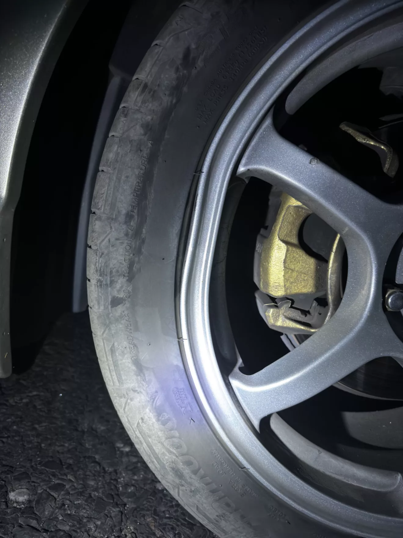 Поймал яму и погнул диск. Резина выдержала, а вот диск получил 2 вмятины.