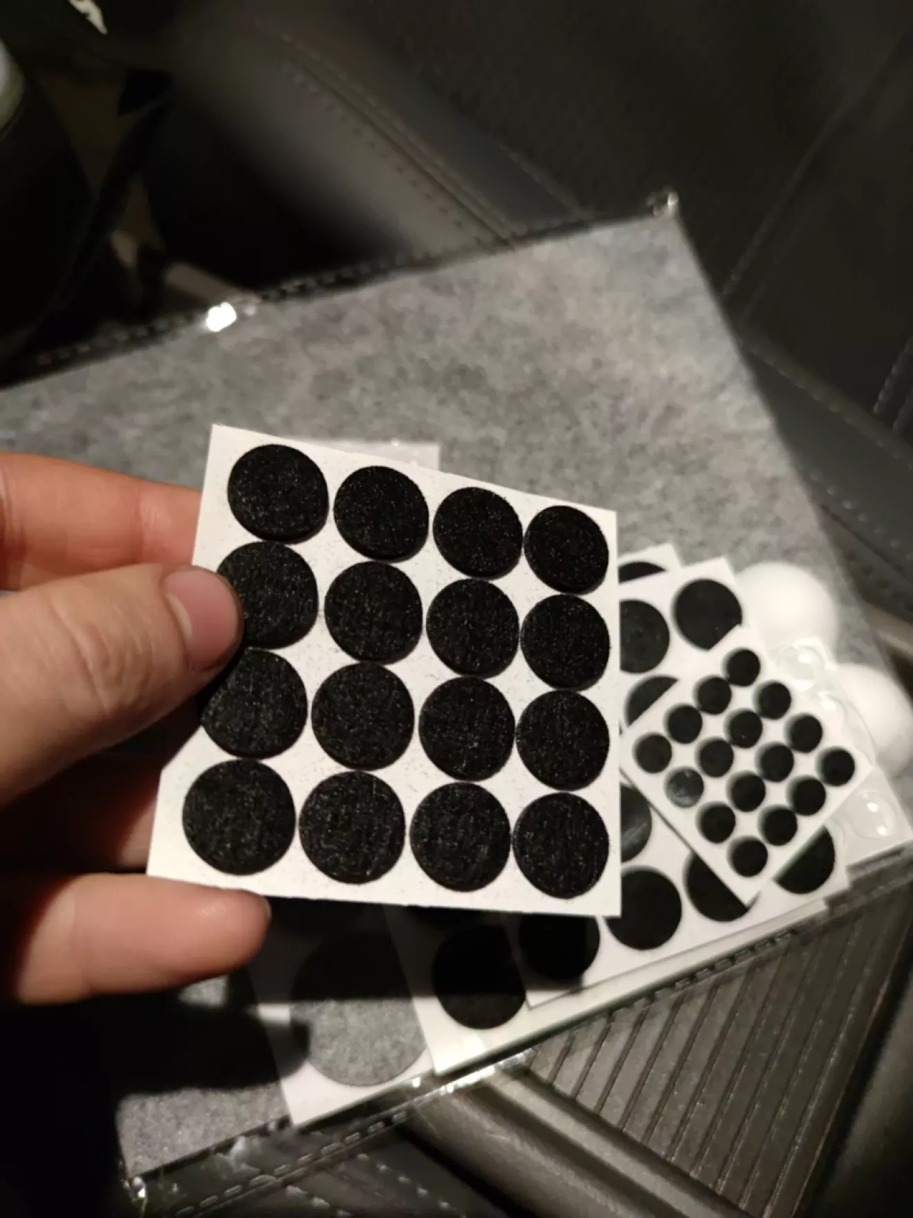 Так же есть в планах из большого куска вырезать квадраты и наклеить их на ремни безопасности в местах их соприкосновения с передними сидениями(чтоб не стучали на кочках)