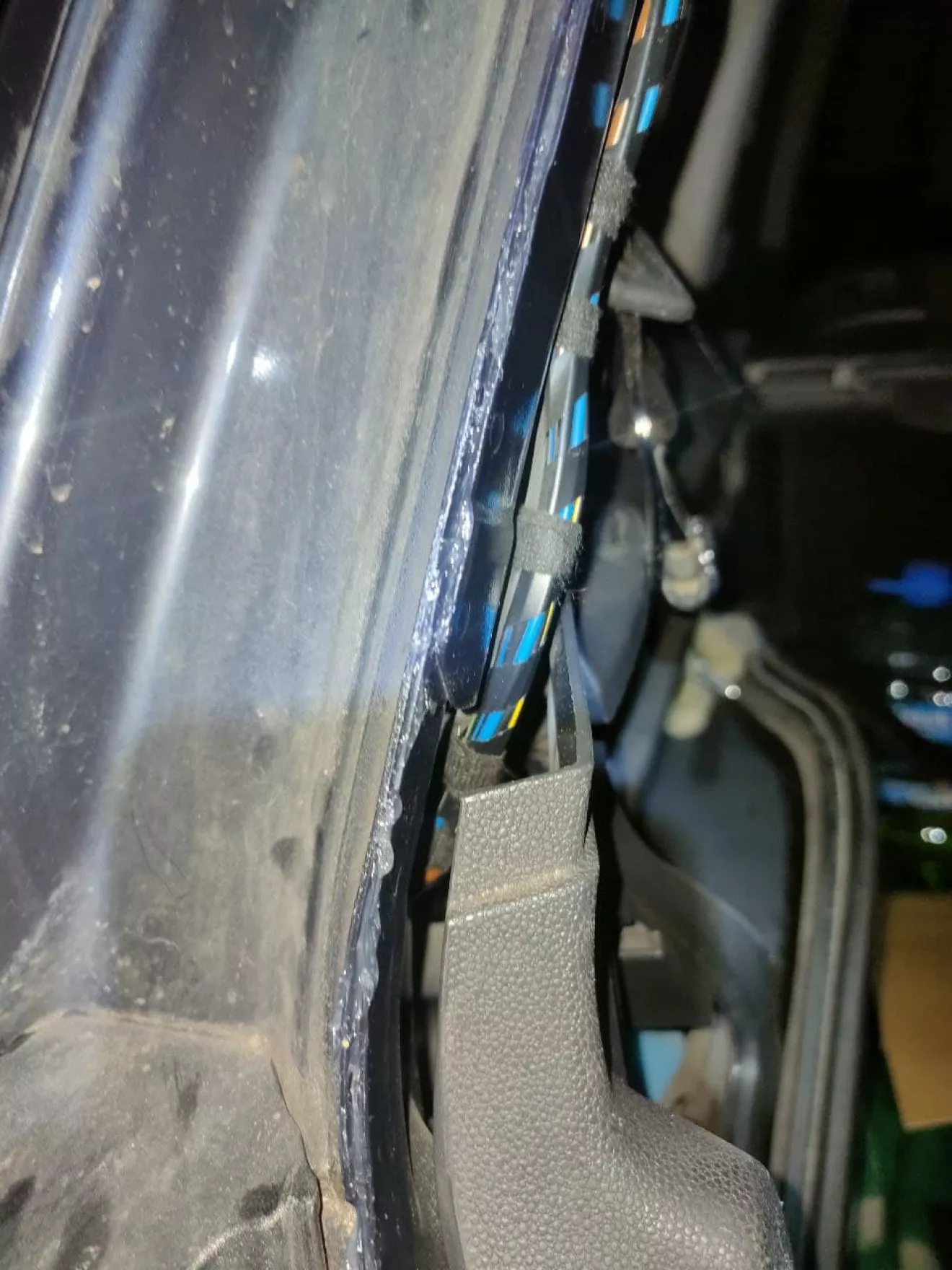 1. Под резинку задней двери, и там заходит с щель между стыком из 3 кузовных панелей: