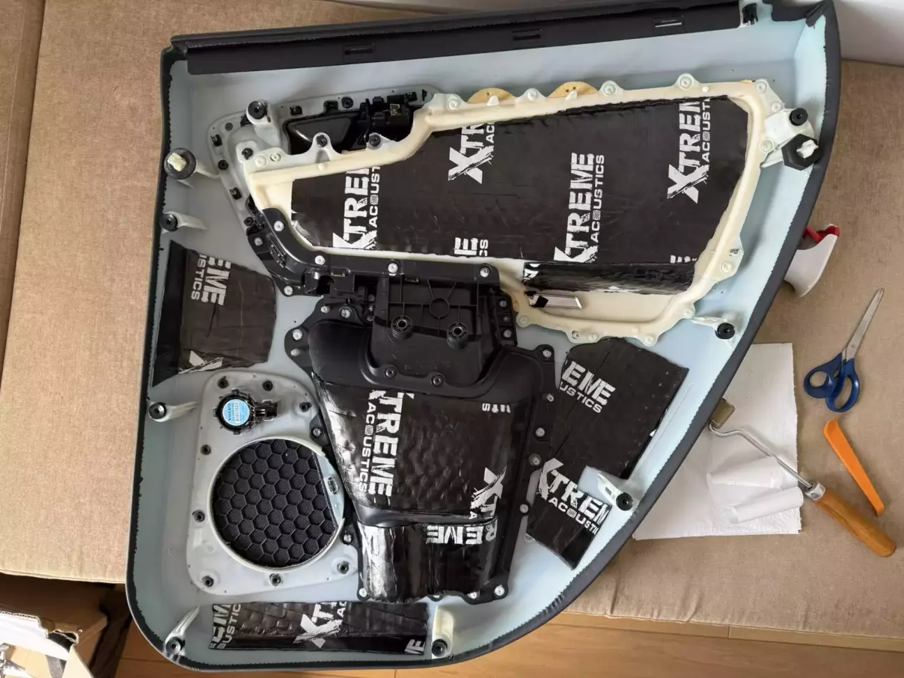 В студіях клеять все одним листом, я клеїв сегментно оскільки лист менший ніж карта, це важче зробити, та хотілось зберегти ремонтопригодність карти без демонтажу шумоізоляції в подальшому.