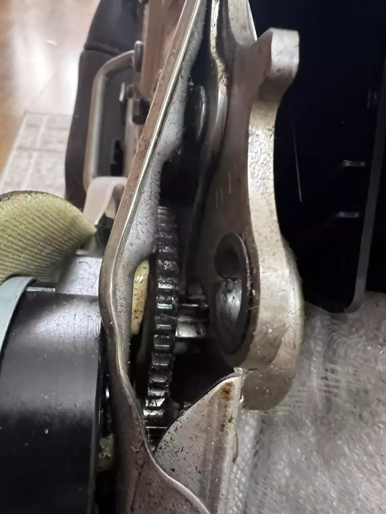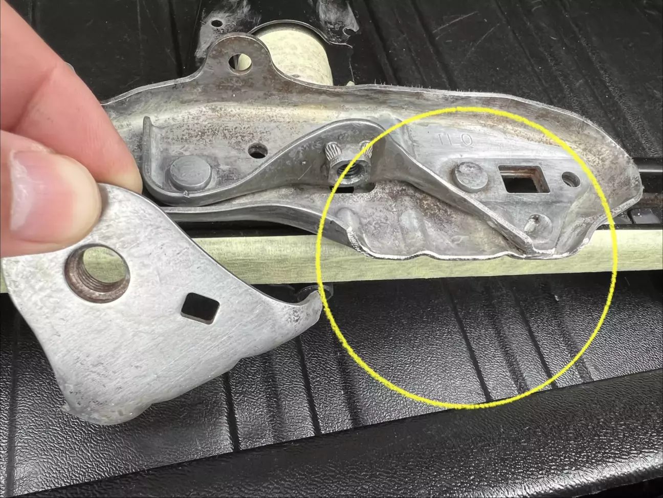 Знявши з сидіння пластикові накладки, щоб приміряти нову бокову від Exe, побачив металеве вухо для кріплення паска безпеки, яке заважало встановленню нової накладки без отвору. До того ж верхня частина салазок сидіння була іржава, скоріш за все від хімчисток за період експлуатації авто, всі інші елементи мали гарний вигляд.