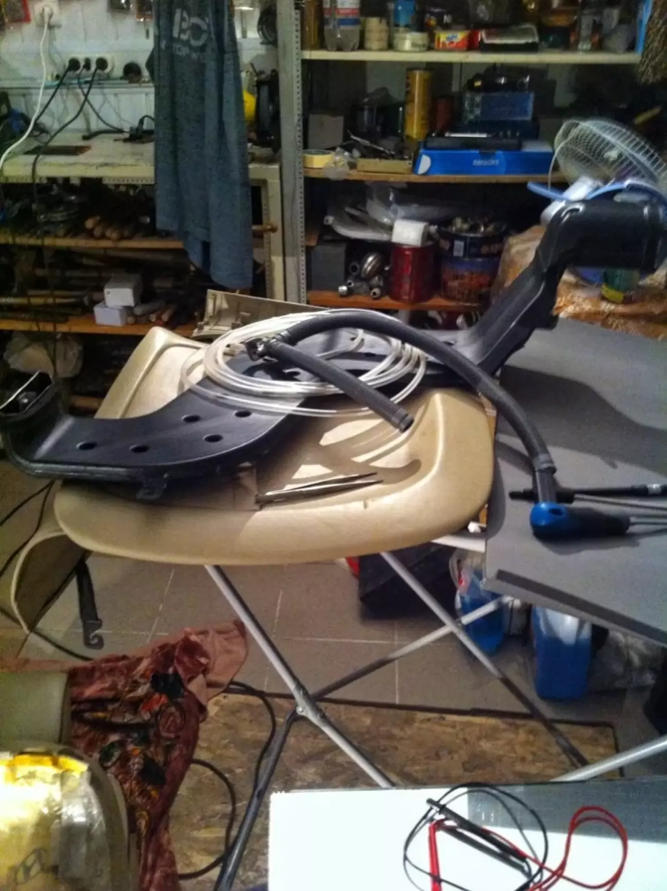 Давно мріяв о вентиляції водійського сидіння. Час настав зробити це. Врізався у систему вентиляції під сидінням біля вентиляції ніг задніх пасажирів. В гофровану трубку під сидінням вмонтував вентиль закривання вентиляції. Тонкіші трубки вмонтував у сидіння так щоб повітря дуло вище тіла і з боків.