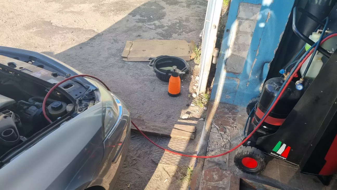 Він сказав і показав пальцем, як то кажуть, що варто було звернути увагу на муфту. Скоріш за все, що ця електромагнітна муфта, яка вмикає компресор кондиціонера - певно трошки підзаїла, тобто за той тиждень простою не спрацювала. Відповідно може трошки щось крутила там на холостих. Ну а тепер - холодить? - та й холодить - шо ще потрібно? Але ні - вже приїхав, то треба провести ТО. Тобто подивитись, чи дійсно втратилась частина фреону, та й взагалі скільки його там і чи нормально він холодить і чи все герметично.