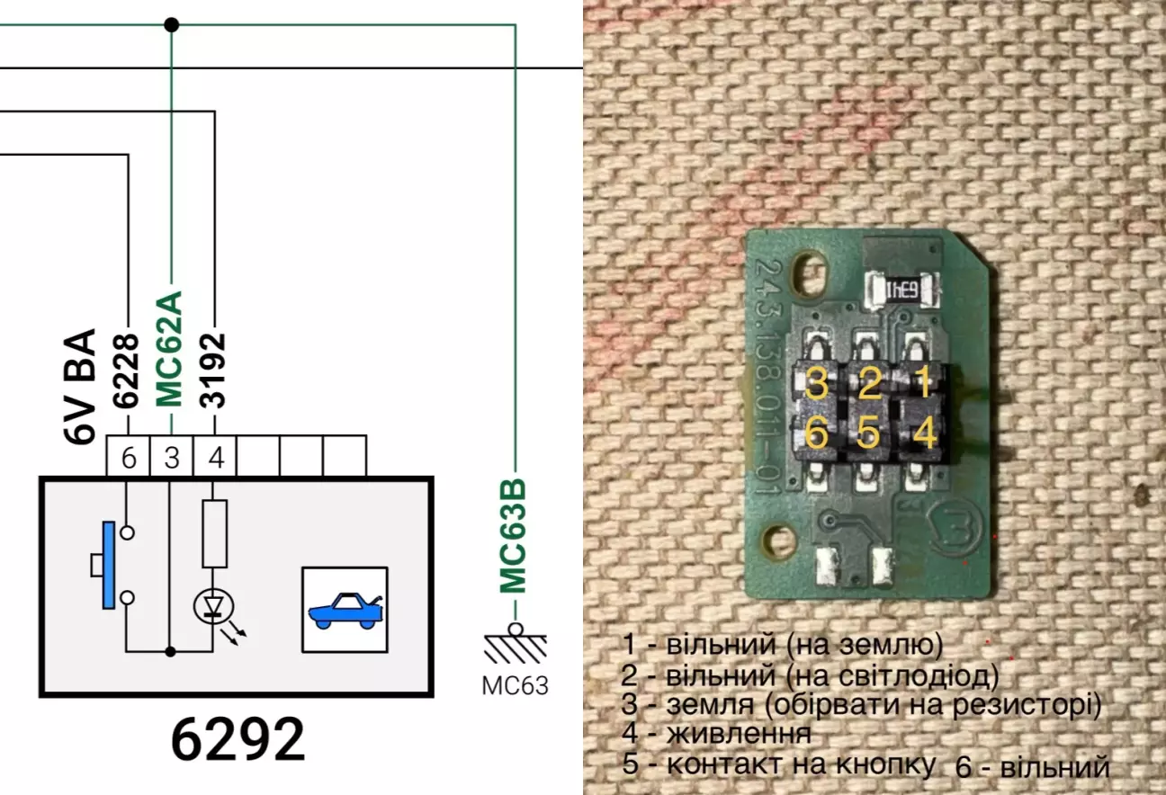 Також я знайшов схему підключення від опеля, але вона трішки відрізнялась від фактичної в кнопці. Замість 6-го піна, як на схемі, на замикання був 5-й пін. Це я дізнався продзвонивши всі піни на кнопці.