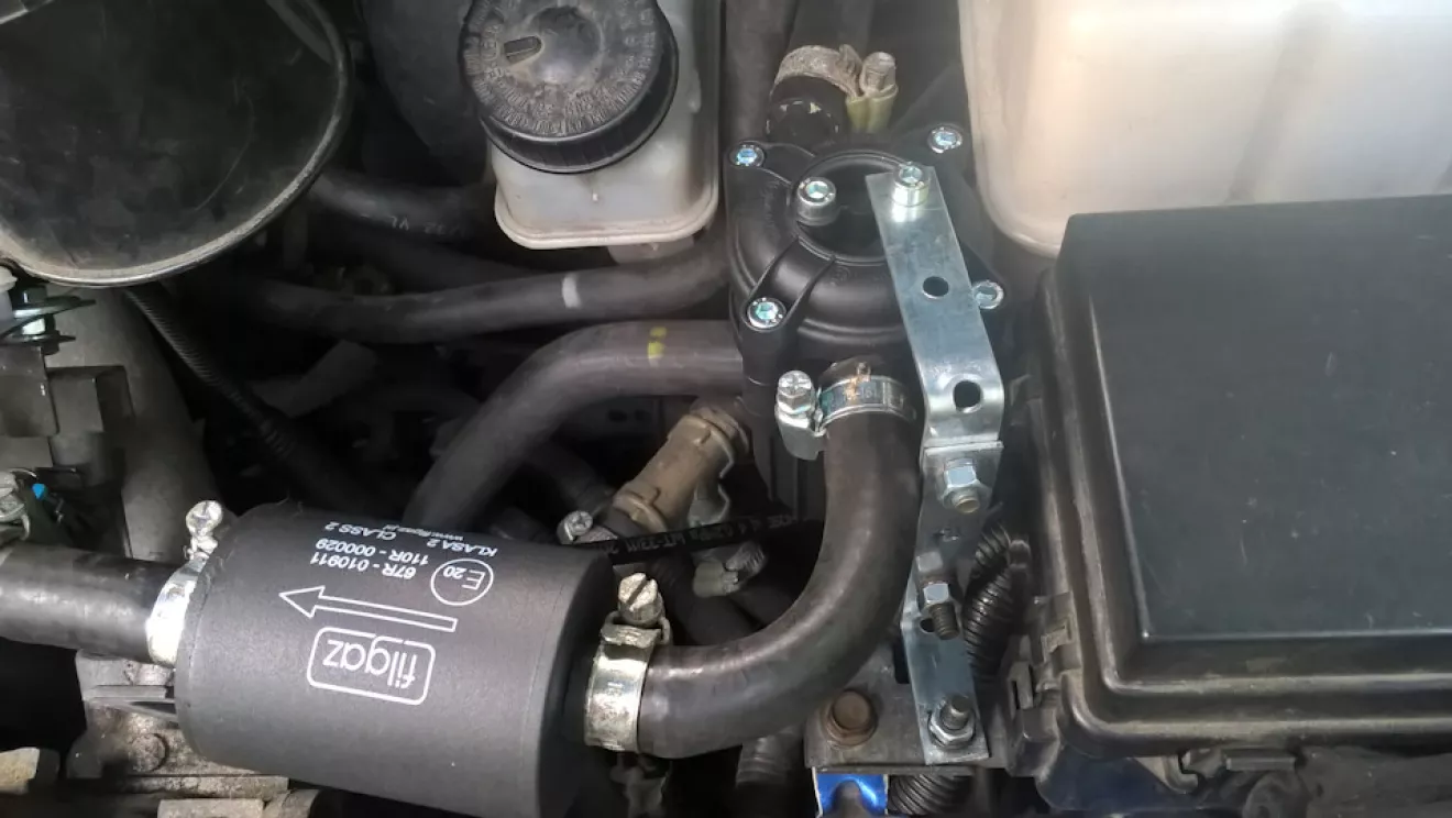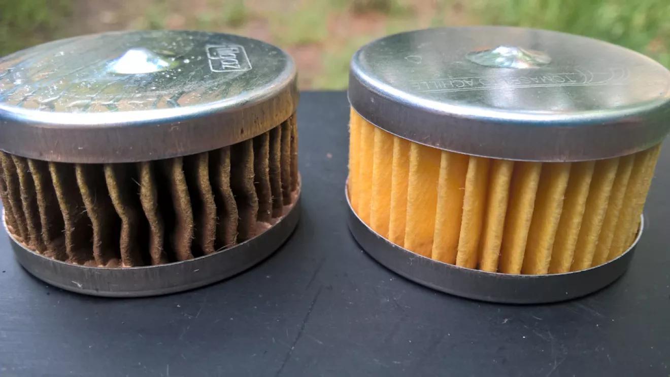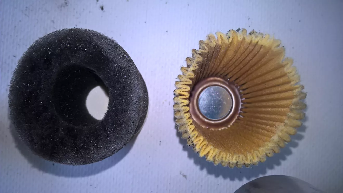 Итак, оба фильтра плохо справляются со своими обязанностями — булпреновый слегка лучше чистит чем бумажный (выходной патрубок также в масле, но меньше), и забивается маслом, что есть плохо для прохода газа, по этому решил поставить ещё фильтр с отстойником: