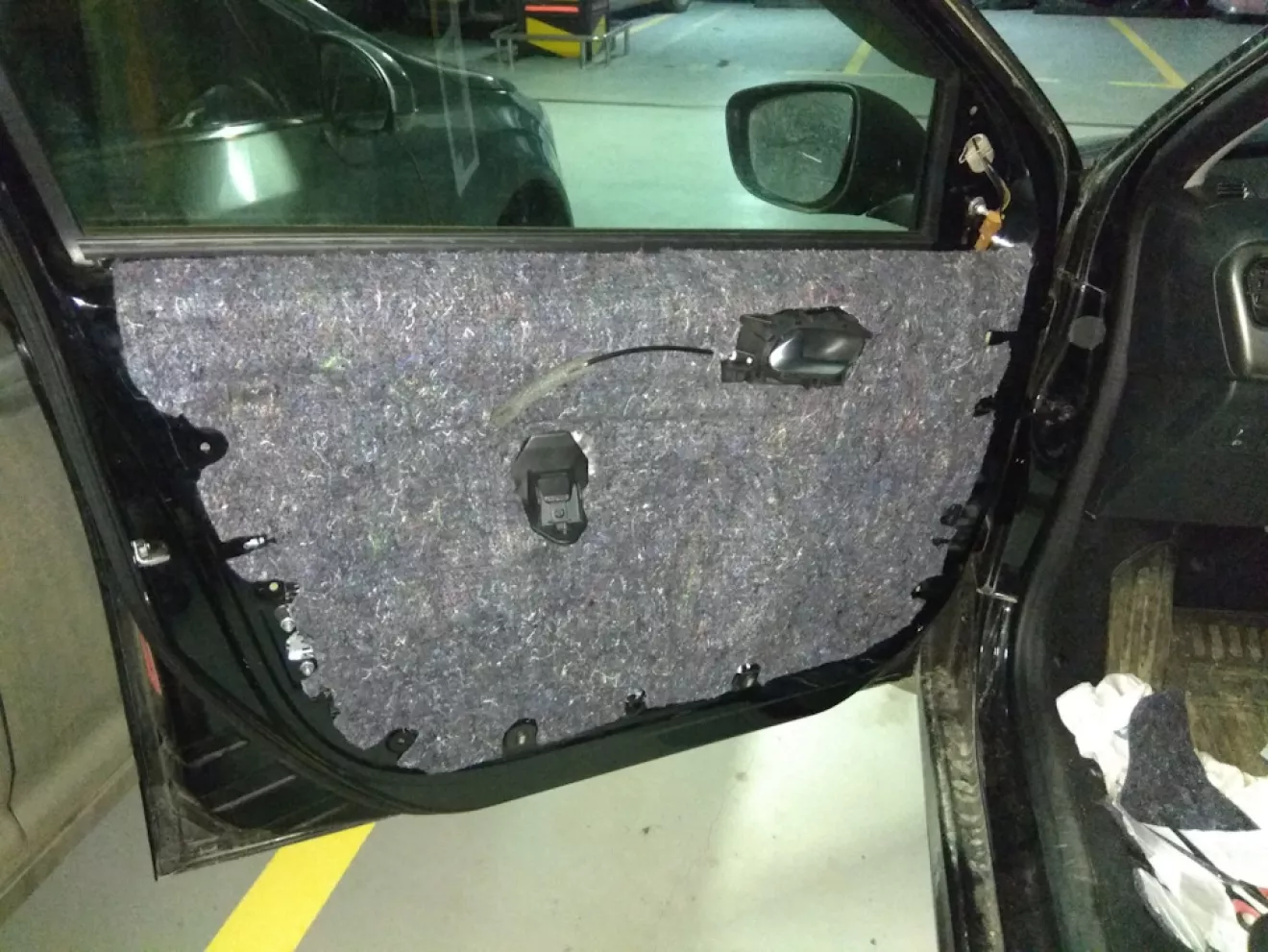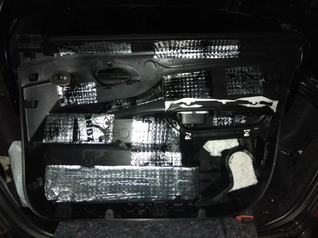 Продолжаю шумоизолировать свой бегемотик. Итак по порялку: вибра 2мм на филенку дверей с внутренней стороны. На внутреннюю стенку вместо полиэтиленовой родной вибра 2 мм по ней сверху войлок 4мм. На карту двери вибра 2мм и войлок 4мм, а также все примыкающие антискрипом 1.5 мм.