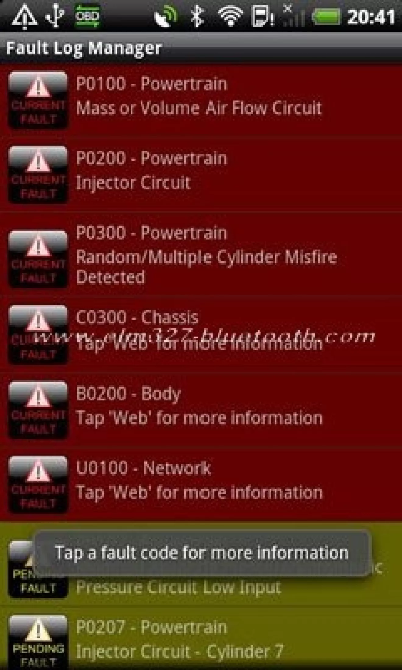 Read diagnostic trouble codes, both generic and manufacturer-specific, and display their meaning (over 3000 generic code definitions in the database).