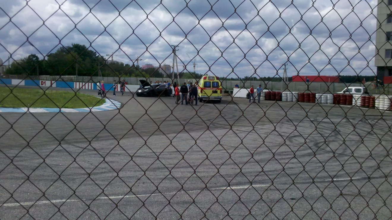 Я вернулся за час до заезда и прокручивал в мозгах трек и как буду ехать. За 10 минут прогрел мотор, стал в очередь… И тут неожиданно "скорая включает" мигалки и все бегут к трассе. Выхожу из машины и вижу что Porsche Panamera Turbo, ехавшая в сессии перед нами стоит поперек трассы… Подхожу ближе и вижу что правая часть передка разбита… Выхожу на трассу и вижу что одна секция бетонного отбойника отброшена на выезд на пит-лейн, а у Порше помята еще и правая задняя дверь и повреждена подвеска с правой стороны… (((