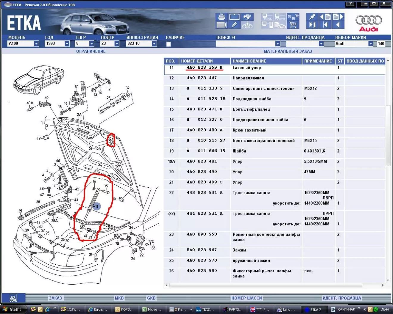 Иду я по ремзоне и тут взгляд задерживается на Ауди 100, а именно на упоре капота. Он представляет из себя довольно немаленький аммортизатор, одна часть которого крепится к стакану, а вторая к кронштейну на капоте (он почему-то отдельно не продается (((( ) Давно хотел сделать себе что-то подобное, а тут почти готовое решение! Осталось только примерить зазор между капотом, коробом воздушного фильтра и акуумулятором. Упор будет как раз над ними. Выглядит деталь на схеме вот так: