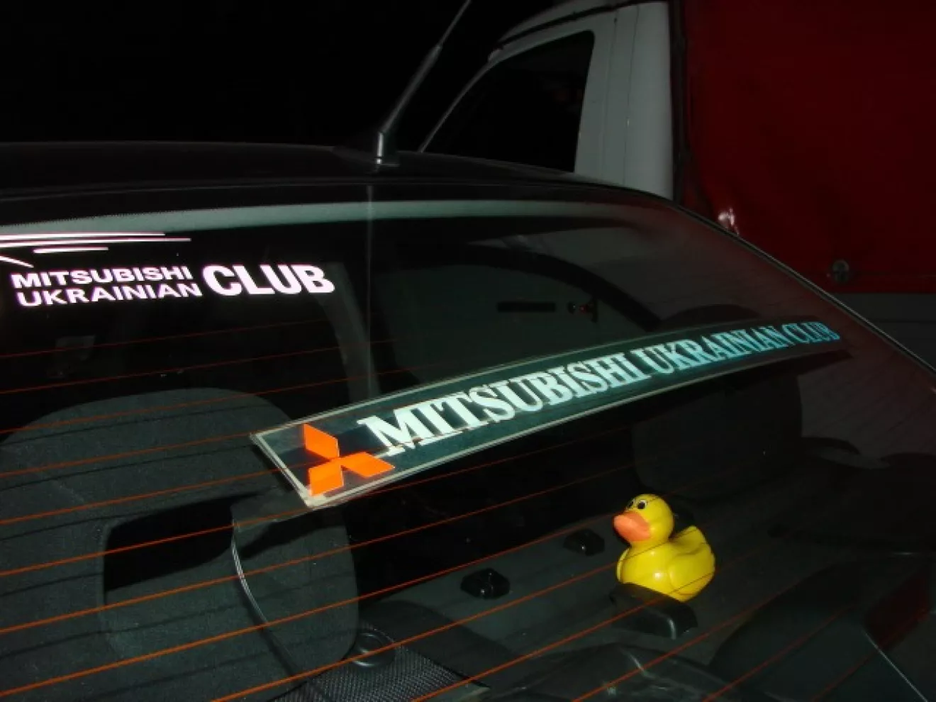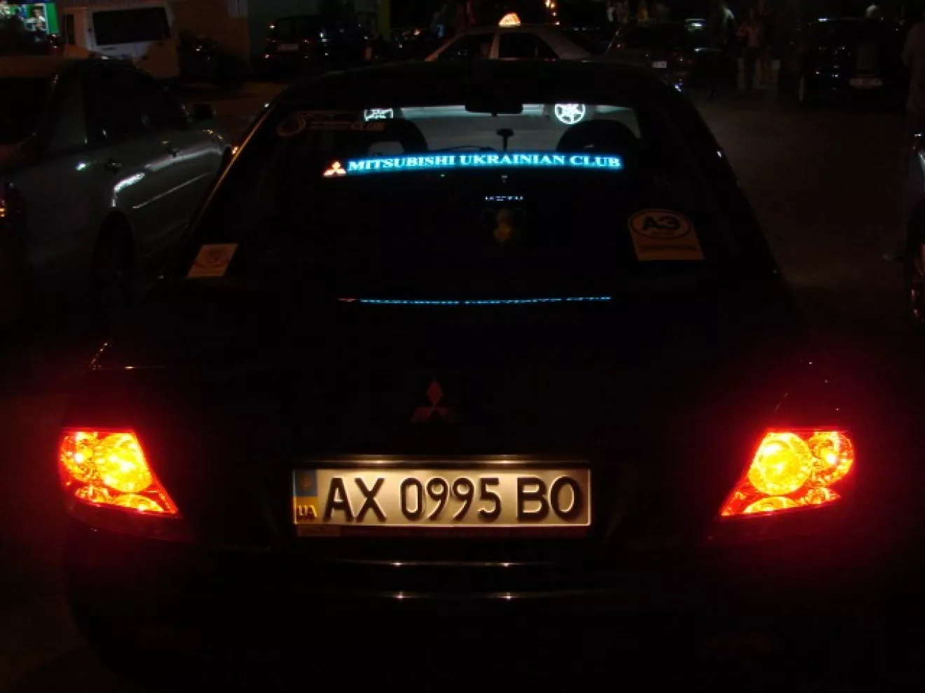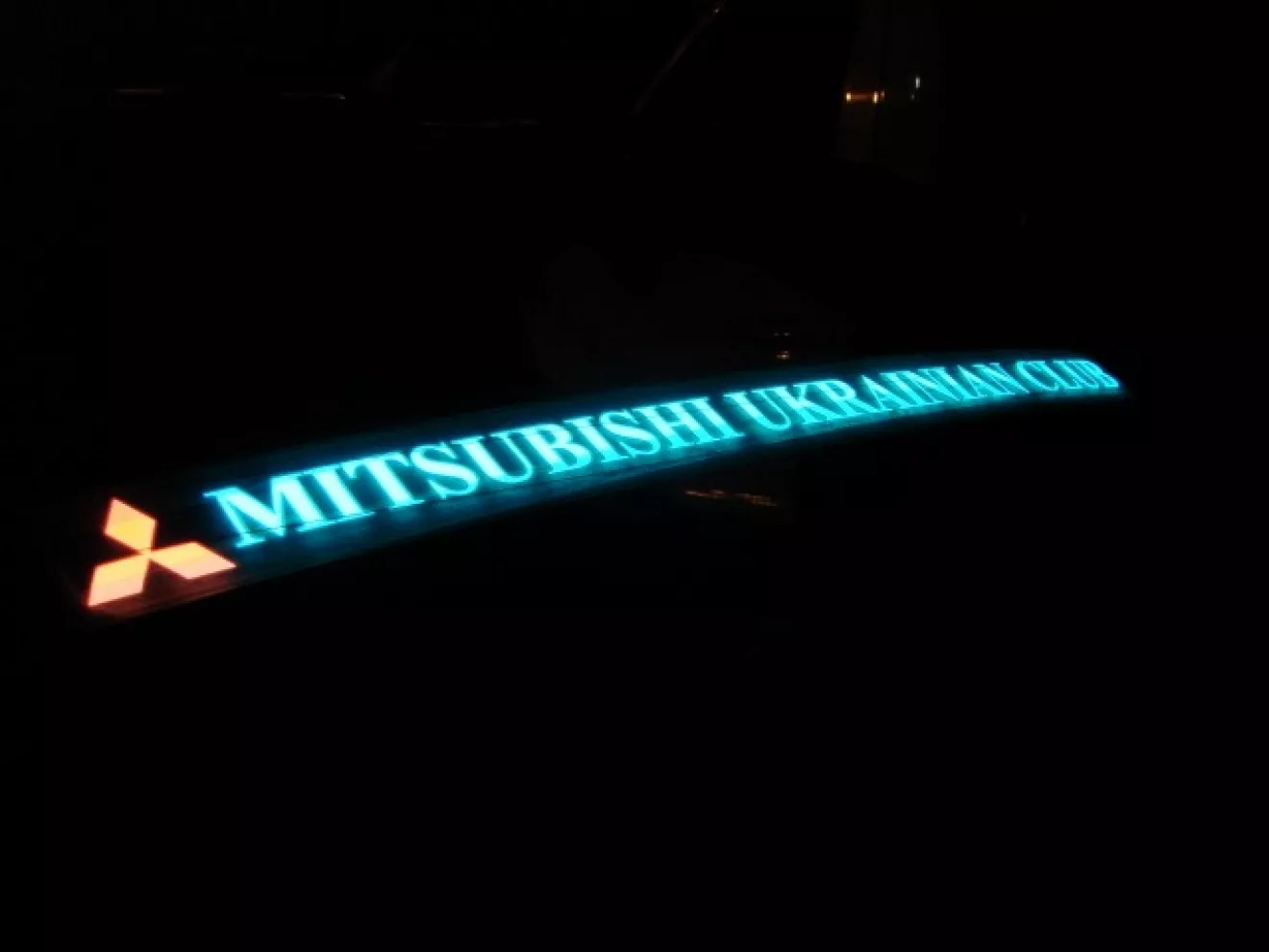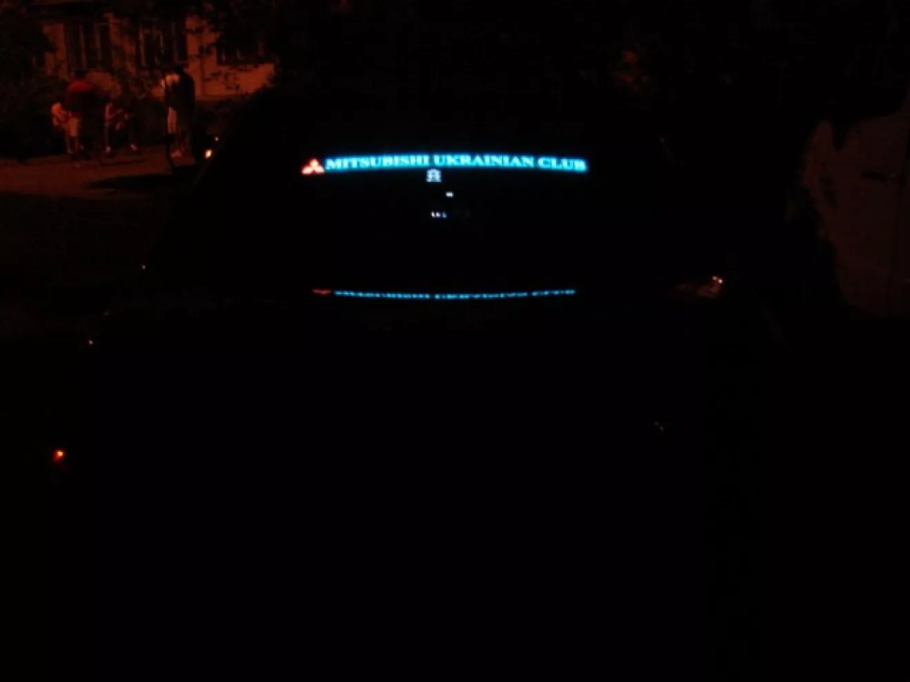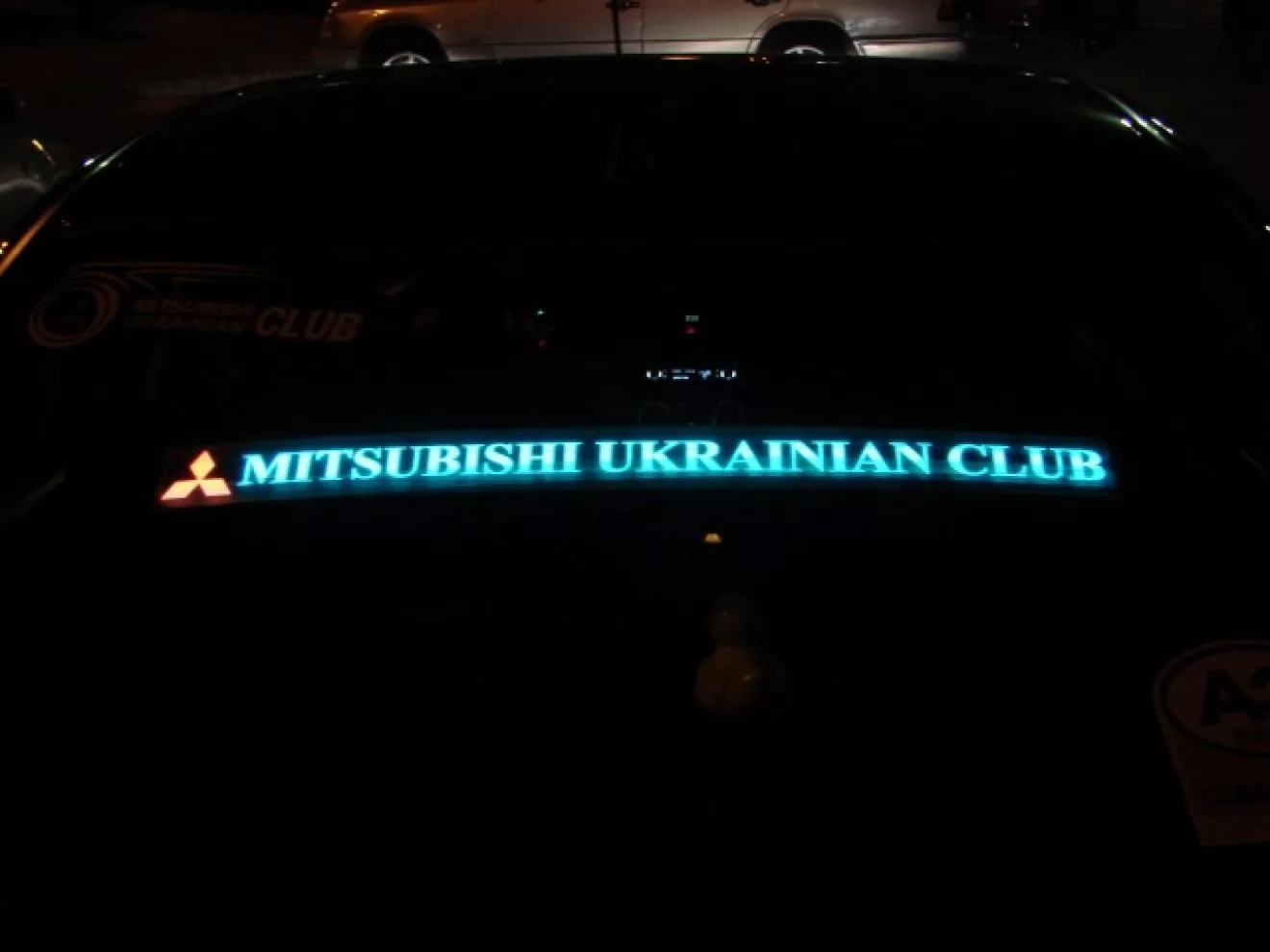 Во время поездки на Автоэкзотику были приобретены светящиеся логотипы Мицуклуба. Себе решил ставить полоску на заднее стекло. С помощью товарища логотип был запитан от… сабвуфера — ну был он удобнее всего расположен :))) Сама полоска приклеена на прозрачный двусторонний скотч. Днем не очень конечно, но ночью просто заглядение!