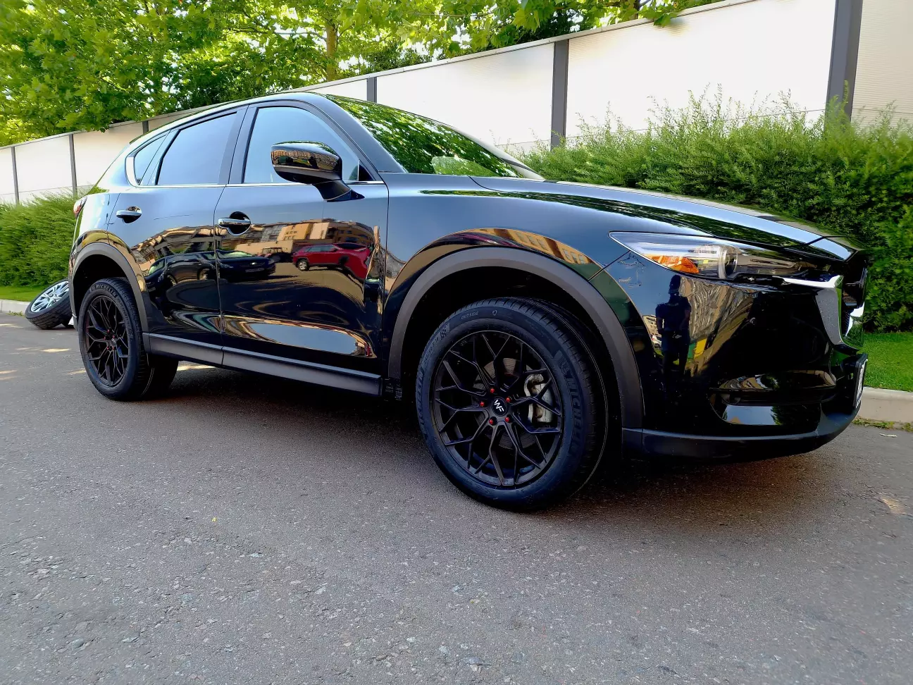 Тут все дуже консервативно. Зміна розмірності дала можливість трошки пофіксити рідний виліт. Тому трошки ширший диск + ширша гума виглядають набагато краще по фітменту. Гума Michelin 245/50/R19. 255а відверто не влізла) Можливо треба було взяти 45ий профіль, але його здається не було на момент придбання в наявності. В порівнянні з рідним 255 різниця в ширині колеса візуально норм відчувається👌