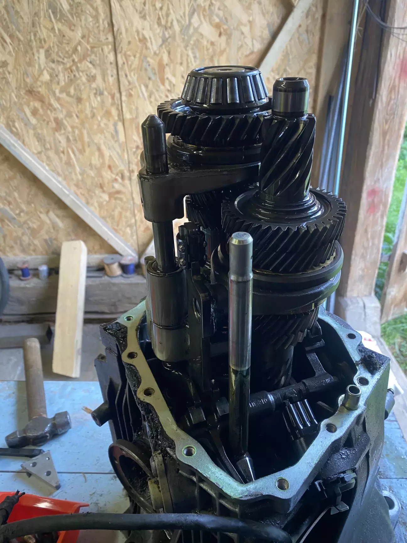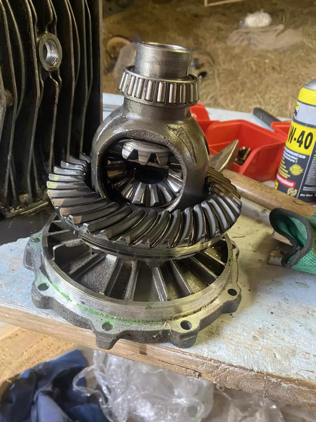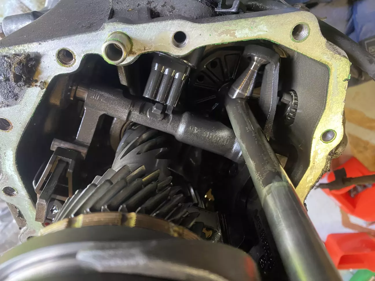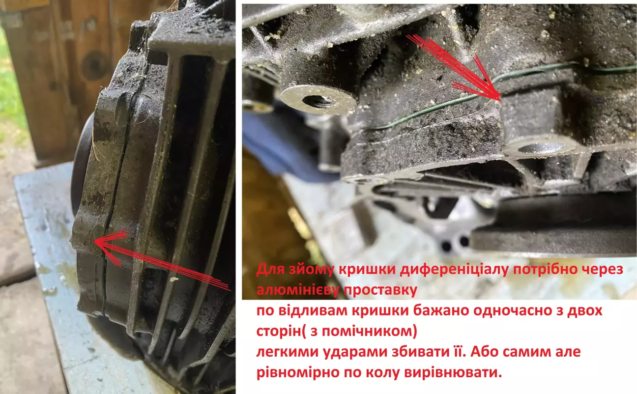 Все навісне ніби зняли, тепер треба зняти шестерню диференціалу. Для цього бажано мати алюмінієві/бронзові/латунні проставки виколотки, але формат бруска зручніше буде, звичайний молоток і помічника.