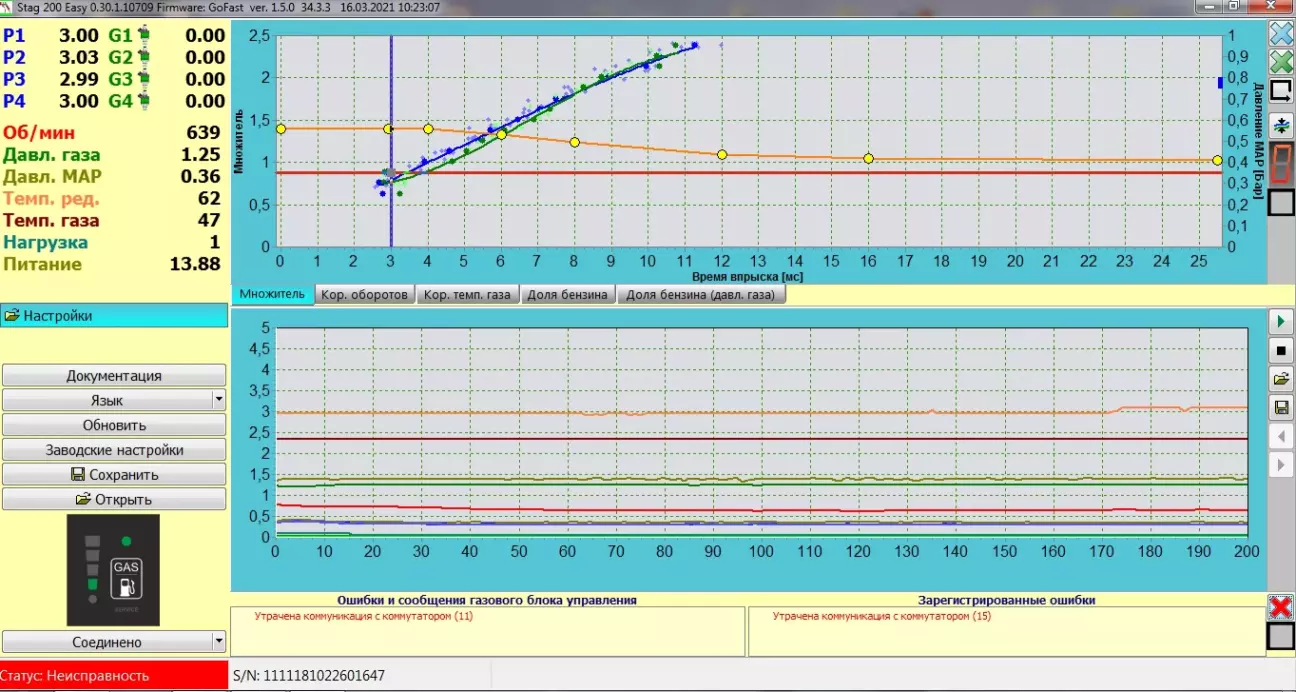 Доброго вечора! ГБО Stag 200 Go Fast видає постійно помилку "втрачено комунікацію з комутатором" і при цьому переходить на бензин, а кнопка про перехід не сигналізує.