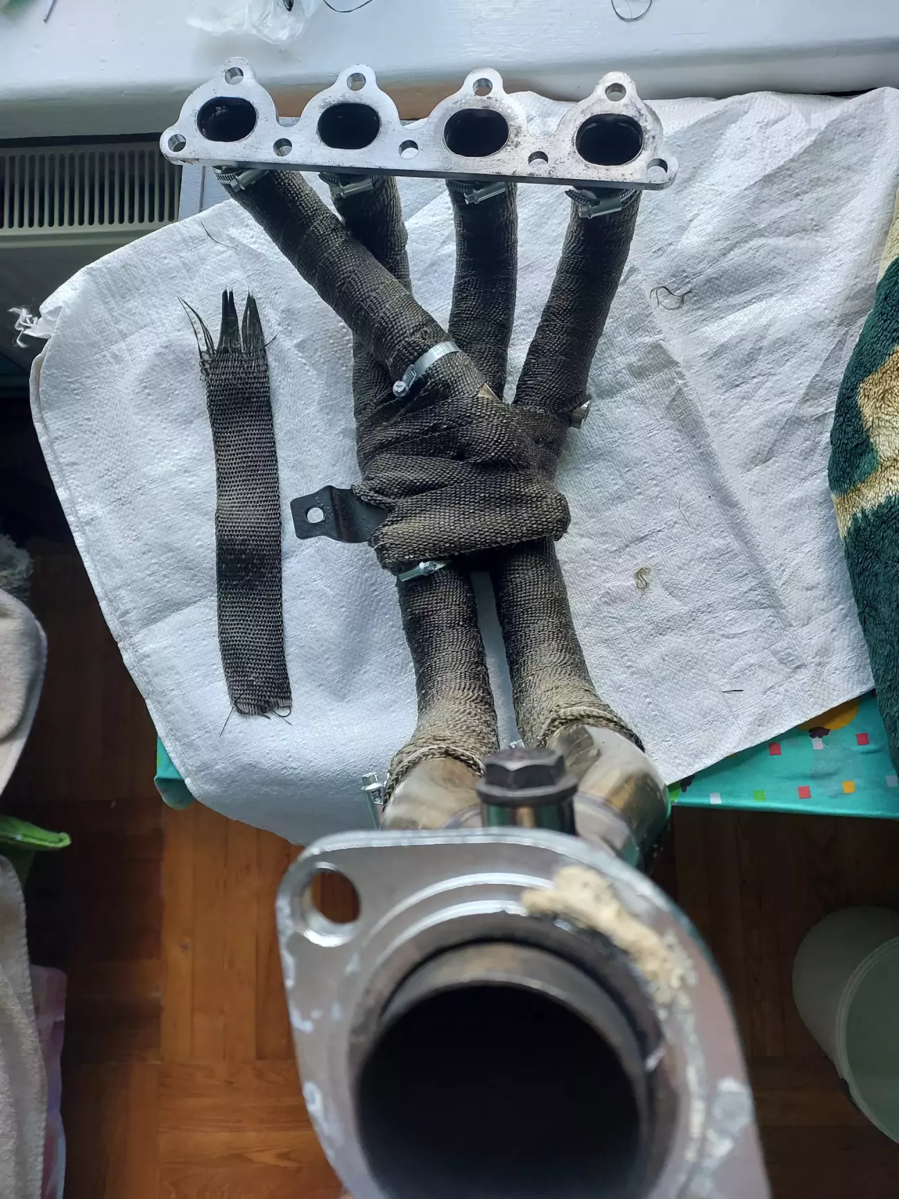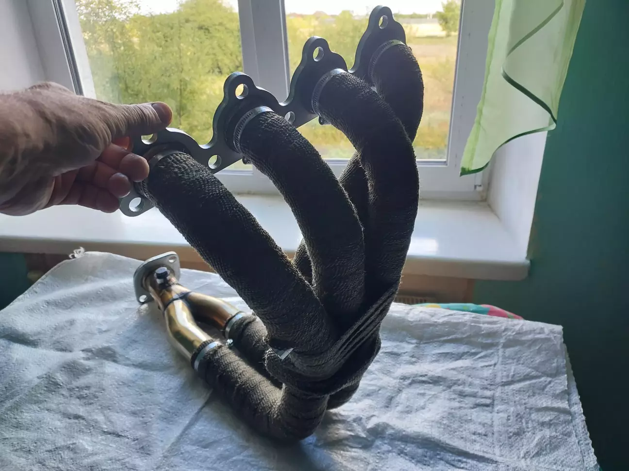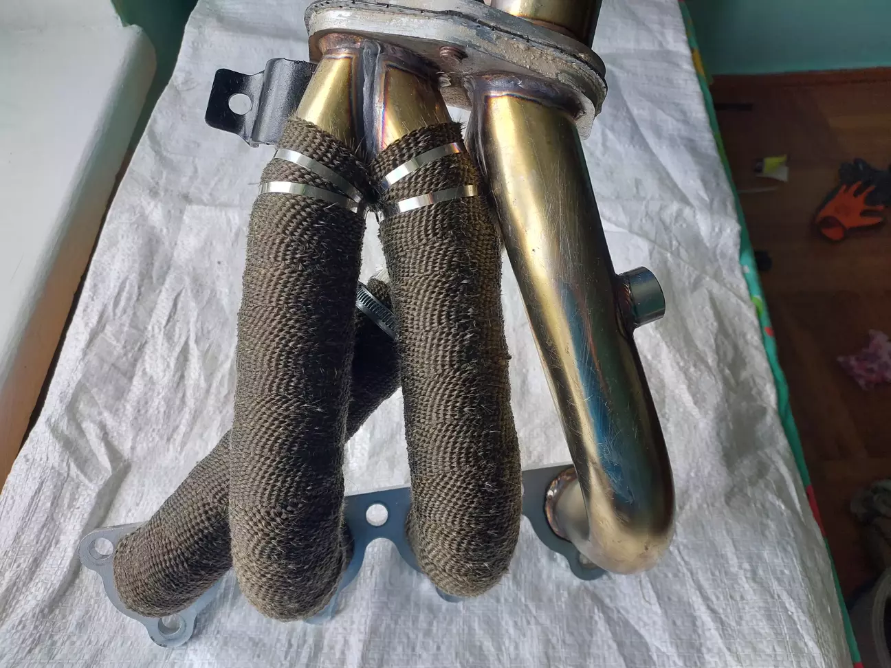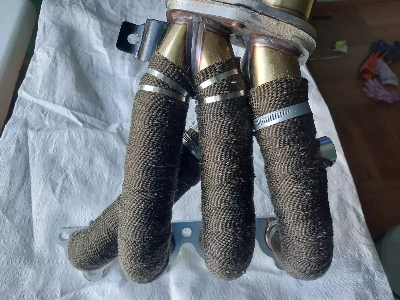 Далі мотаємо суцільним залишком починаючи від 1 циліндру та виходимо на одну з двох наступних прийомних труб, але перед цим весь залишок термоленти ділимо пополам, щоб обмотати другу трубу.