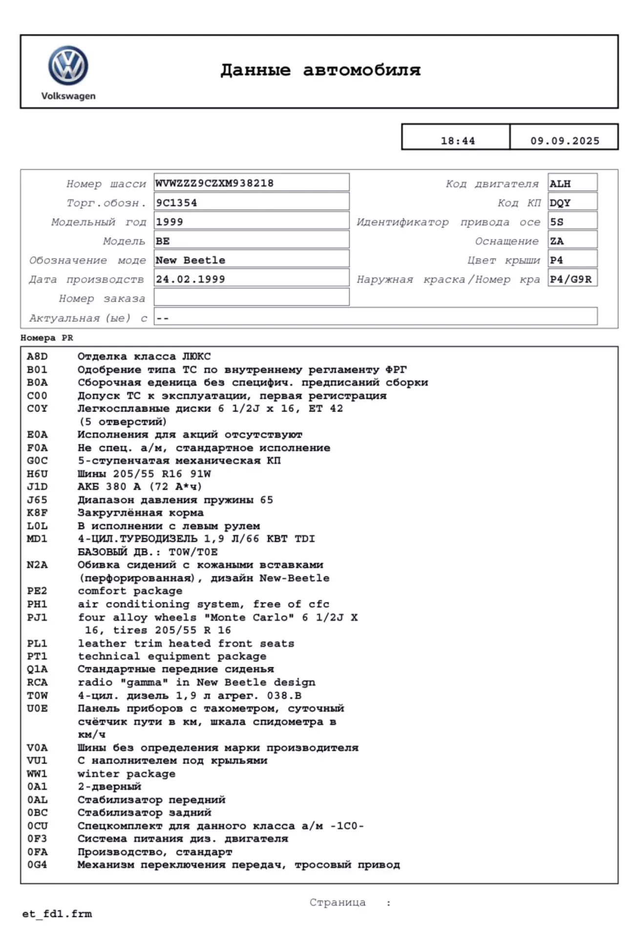 Ось нарешті в моїх руках повна комплектація саме мого Бітла! Чесно… відчуття, ніби відкриваєш капсулу часу… кожен код, кожна абревіатура розповідає про те, яким він виїхав із заводу понад два десятиліття тому.