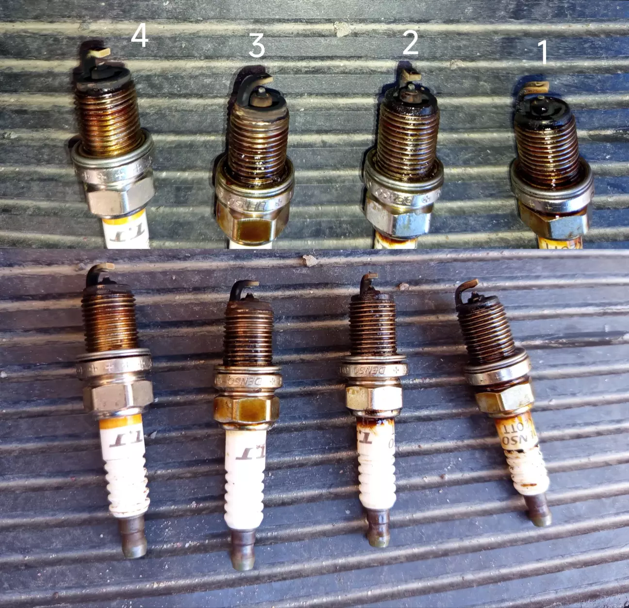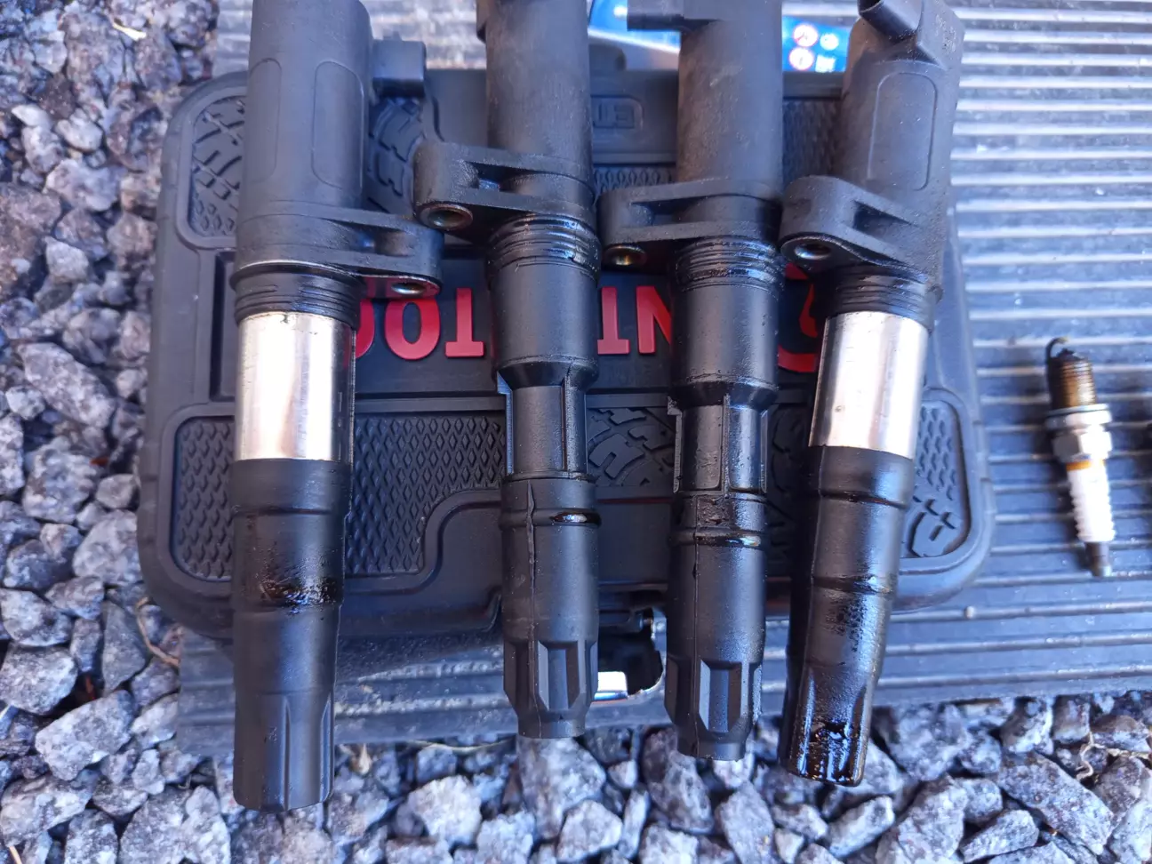 Перша свічка і котушка (від кпп, праворуч) аж добре так були в мастилі, решта трохи менше. Два роки тому проклеїв кришку сапуна, замінив його сальник. А от свічки міняв до проклейки кришки сапуна, то ж напевно налило ще до того. Як міг вимокав його трохи...