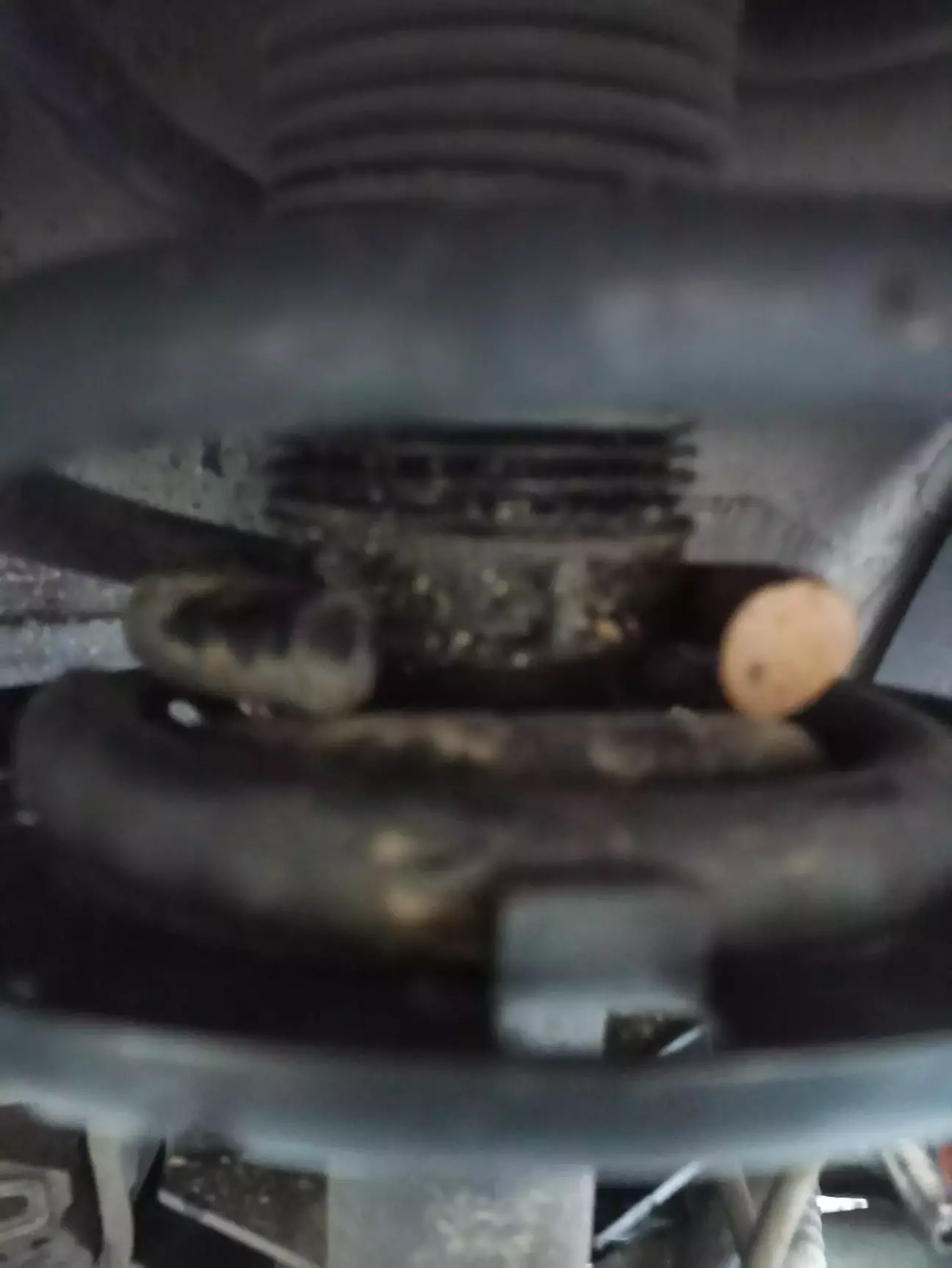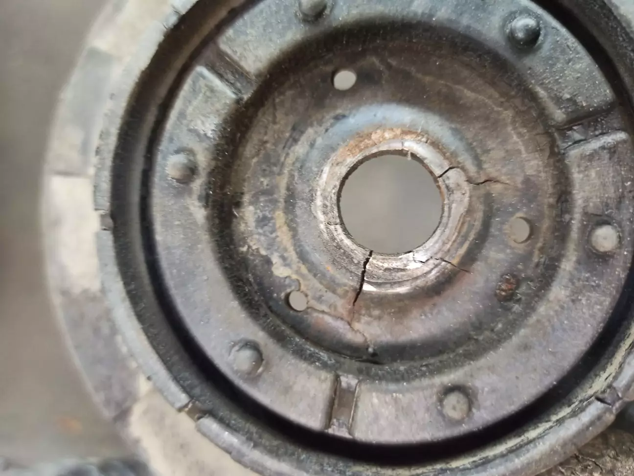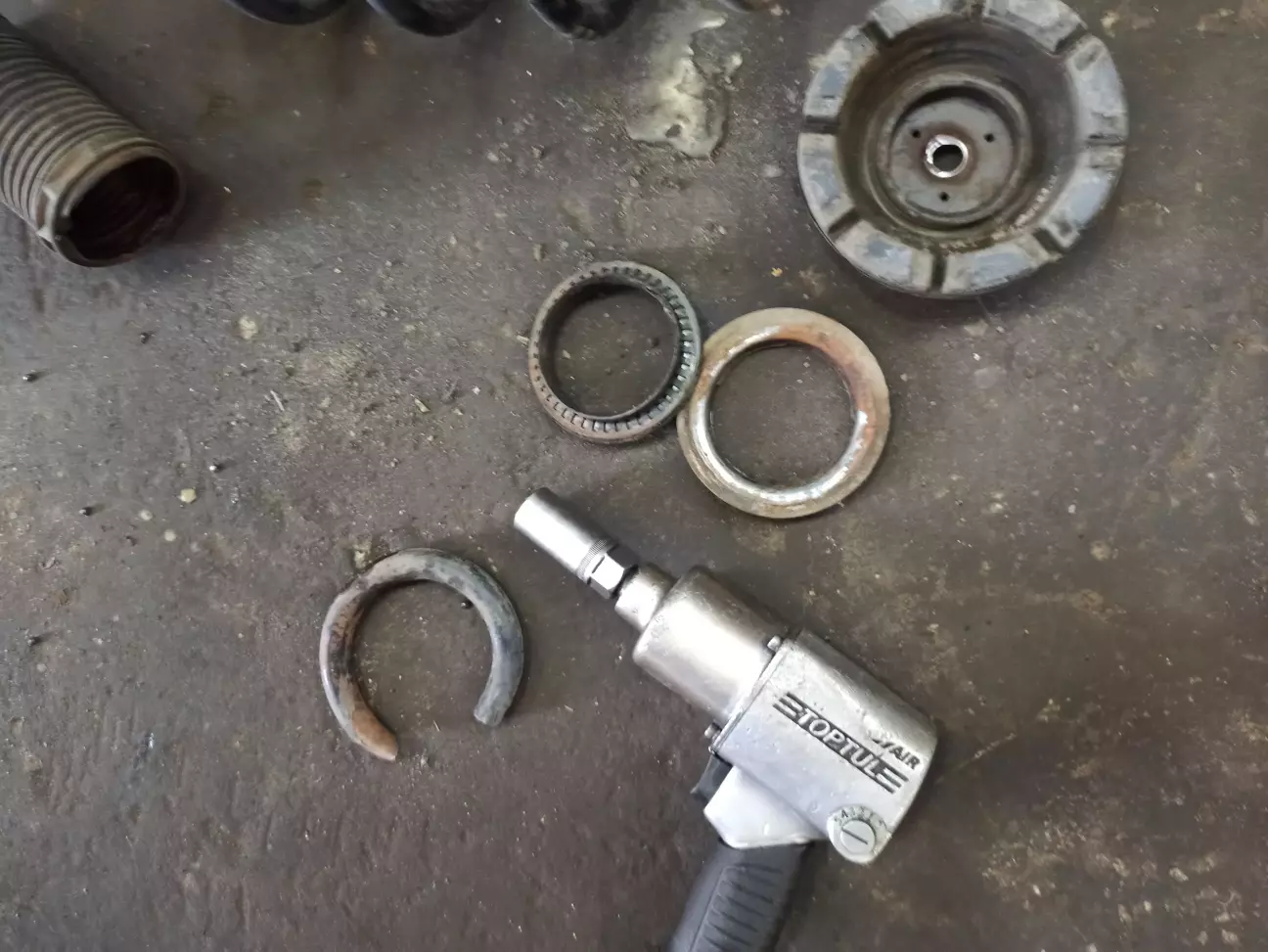 Пружина лопнула спереди слева. Стойка стабилизатора справа, справа же опора амортизатора в хлам. Слева же развалился подшипник амортизатора. И опора тоже лопнула.