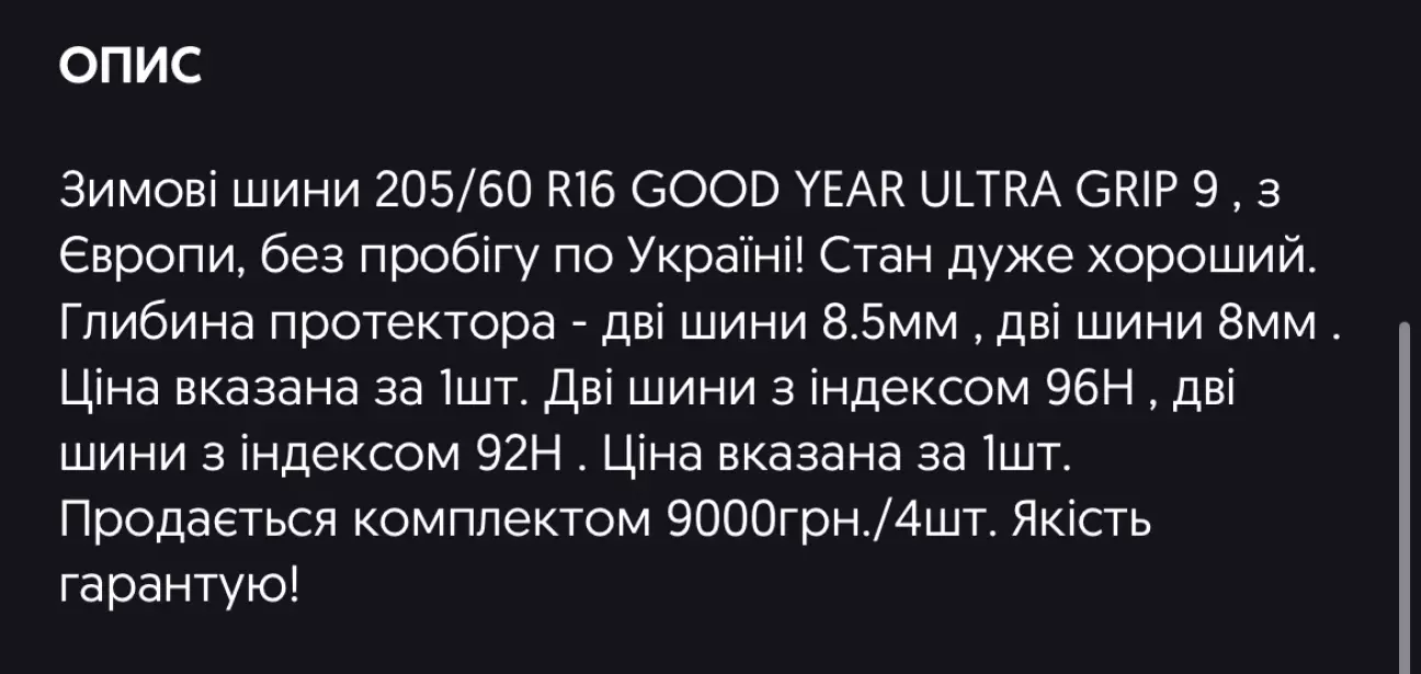 Переглянувши вартість нової, і те що як показує практика автівка затримується у мене на 2-3 роки, вирішив йти вже протоптаною доріжкою та придбати легке б/в. На цей раз придбано Goodyear UltraGrip9, початок 2023 року, залишок 8мм за 9000/комплект. Стан візуально хороший. Різнобій 2 x 96h, 2 x 92h.