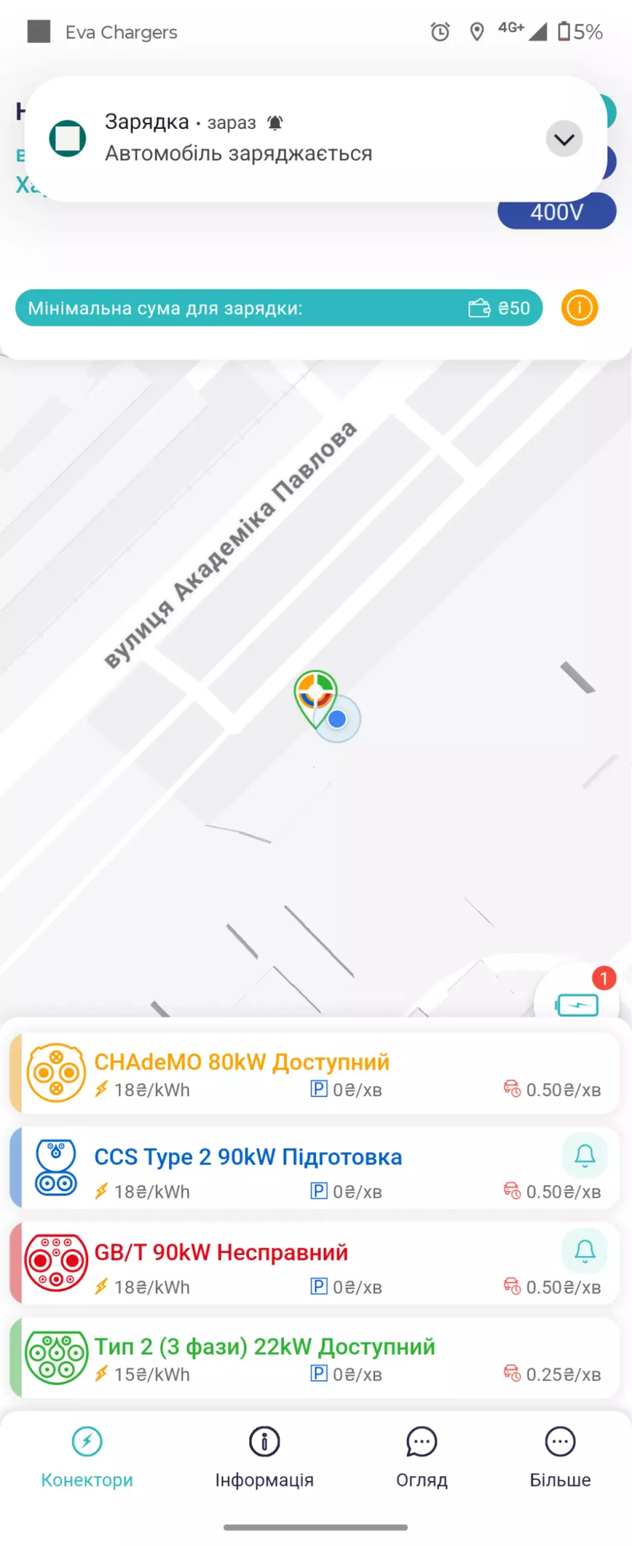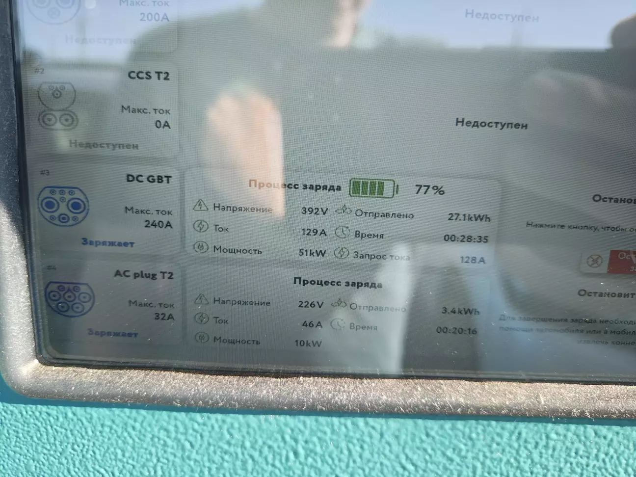 Обираю швидку CCS Type 2, бачу що написано "Підготовка", тисну "Старт" і наче пішла зарядка, зверху в телефоні вискакує "Автомобіль заряджається", а потім вибиває, пробую знову - вибиває, ще і ще, потім видає Помилка. І так я намагався підключити мабуть на протязі півгодини, і з оператором спілкувався і нічого не вийшло. В цей час під'їхала Honda на швидку зарядку з конектором GBT і почала заряджатись. На що оператор Eva Chargers мені повідомив що одночасно два конектора на швидку зарядку не працюють. Ось так і "спробував".