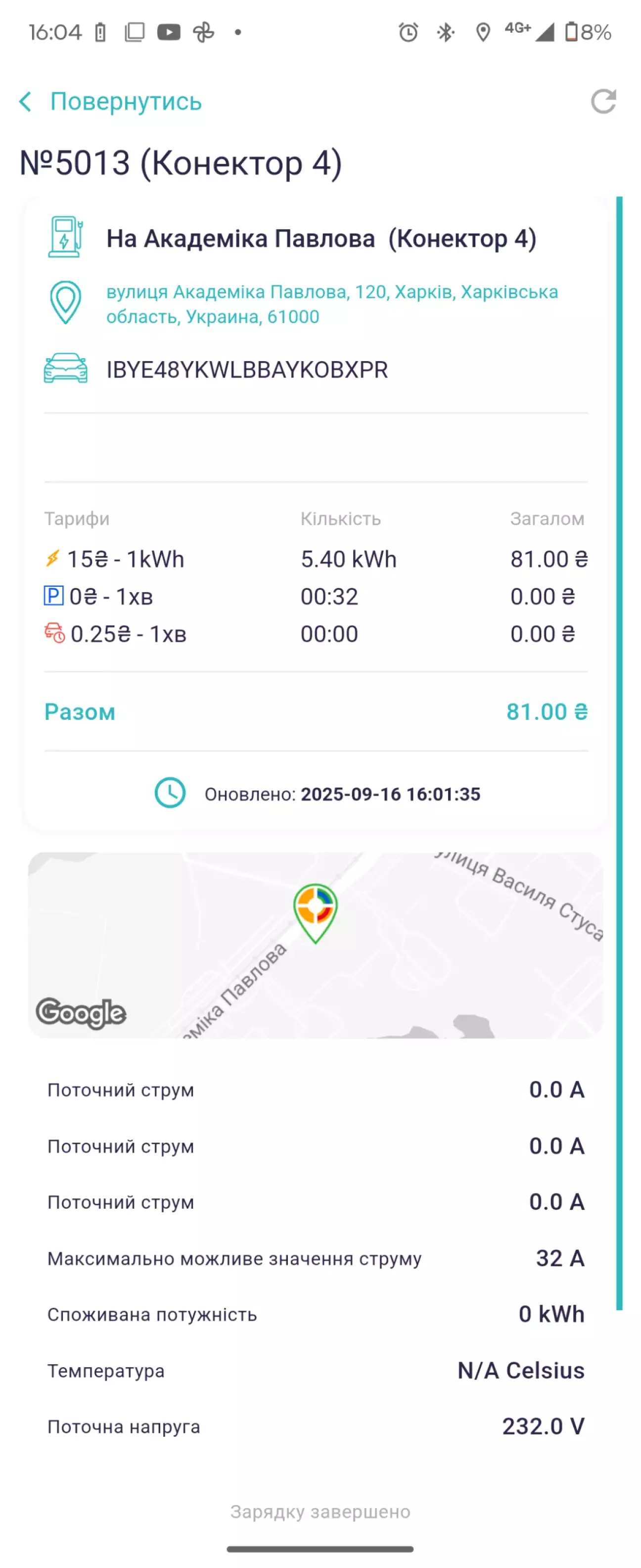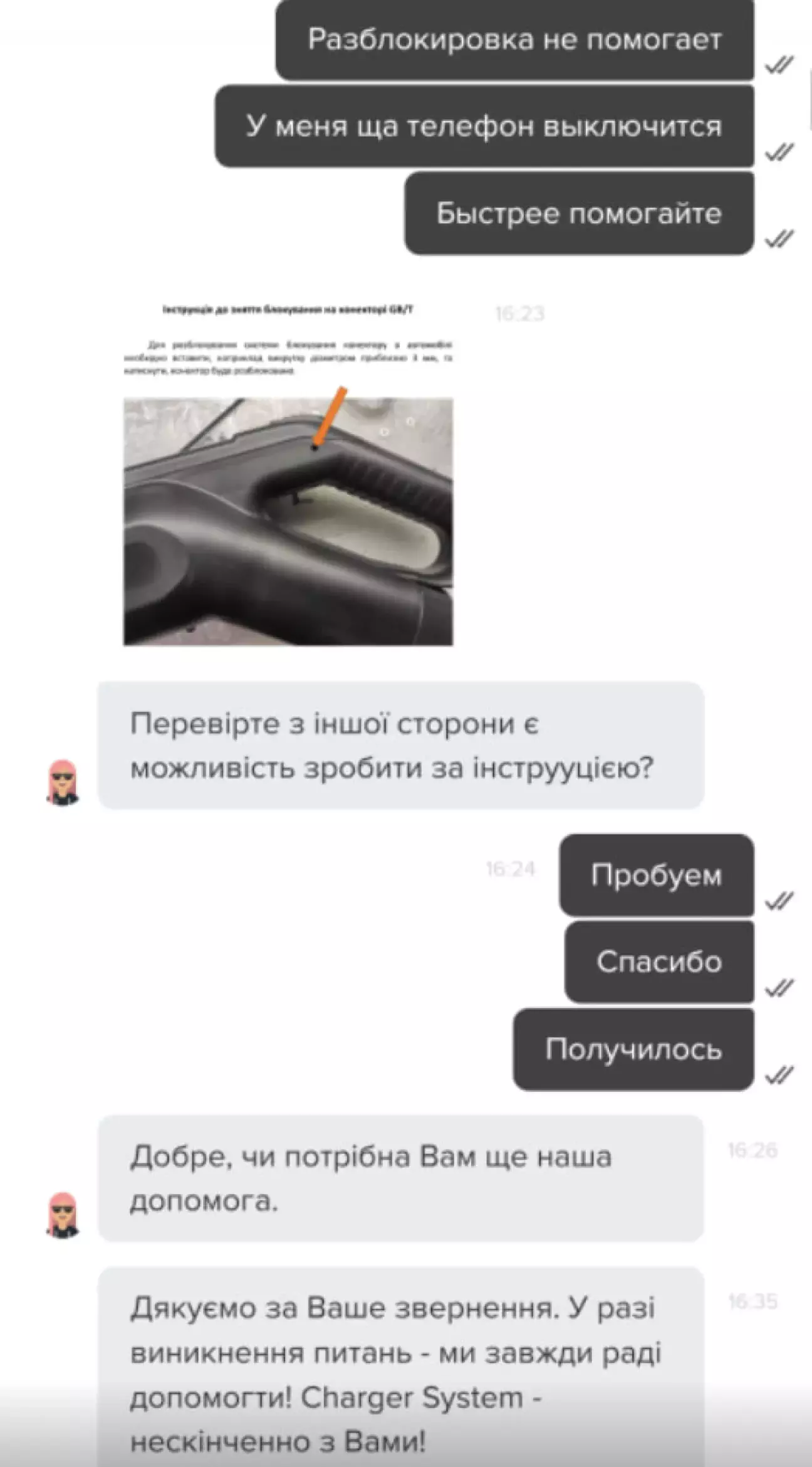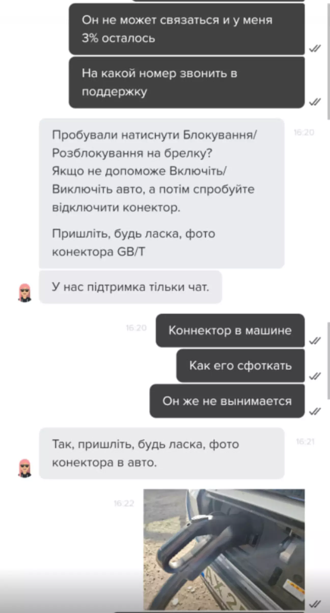 Він відключається від заряджання через додаток (інакше ніяк) і не може витягнути пістолет з роз'єму зарядки, спробував і я - і нічого. Півгодини мабуть ми крутились біля його авто, і включали і відключали і через меню авто пробували - нічого. Власник Honda напрягся. Я пишу оператору зарядки, так і так, не можемо витягнути пістолета з порту зарядки, він заблокувався. Кажуть - хай пише власник авто, ми допоможемо. Але в той самий час у власника повністю розряджається телефон, а на моєму теж 3-4% залишається заряду. Кажу оператору, дайте номер телефону для допомоги і на відповідь отримую що тільки через чат в браузері телефону. Ох і сервіс... Власник Honda вже матюкається))
