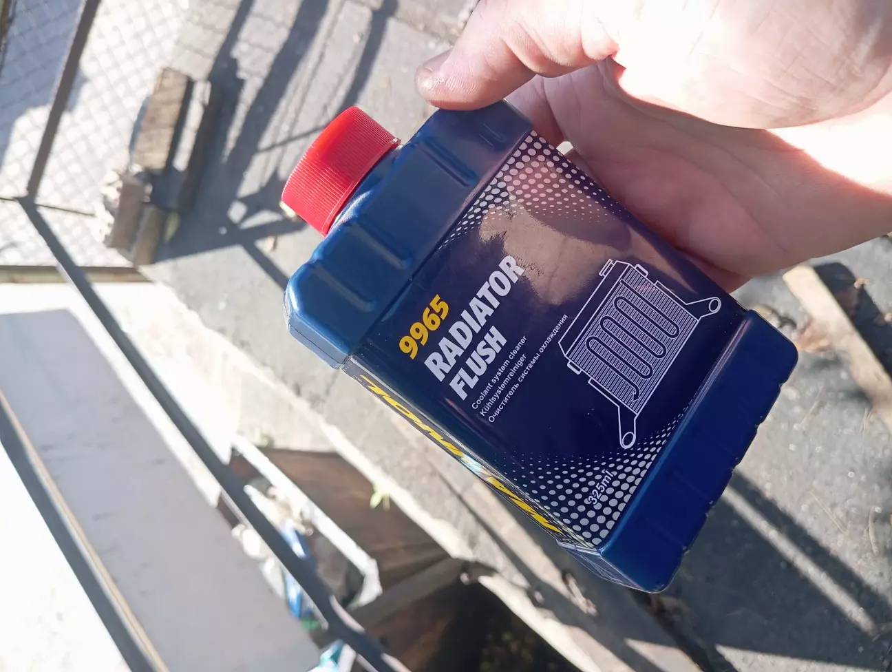 Ще перед заміною радіатора я з'єднав патрубки пічки між собою, все за логічним ланцюжком. Взяв 15л дистильованої води для промивки системи та промивку від Mannol. Маноловську промивку додав прямо в старий антифриз, і дав попрацювати на холостих 15 хвилин, після цього відразу ж відкрутив пробку на радіаторі та злив старий антифриз. Потім було 3 цикли промивки звичайною дистильованою водою, зливалось і заливалось десь приблизно 5 літрів, після третього циклу промивки , зняв бачок щоб помити від осаду. Не зкажу що було дуже багато бруду. Вода стала чистою вже на другий цикл.
