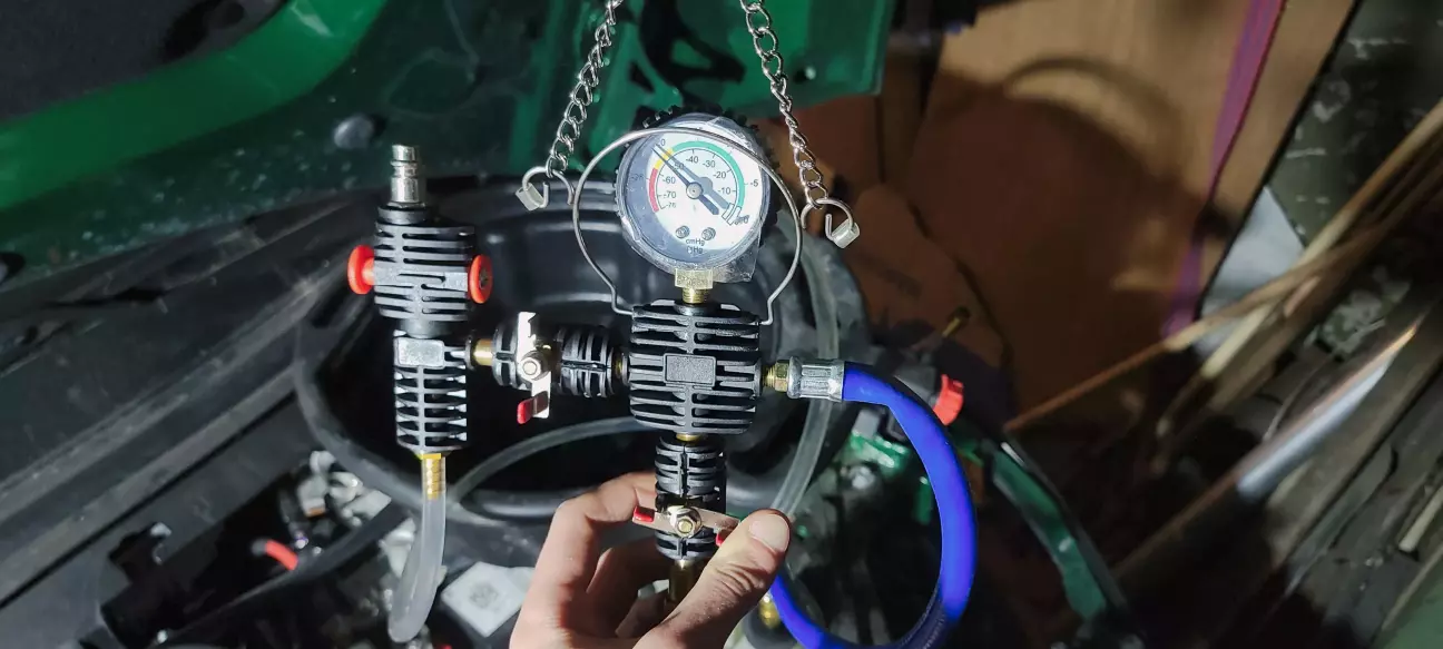 В двох словах - до приблуди чіпляється компресор, який через клапан Вентурі створює розрідження. Після цього треба перекрити краник подачі рідкого вакууму (с) і перемкнути вхід на відерце з антифризом. Перші 5л залетіли аж бігом. А от під час другої заправки десь після 2л тиск впав до нуля і бачок заповнився. Тобто в систему зайшло десь 7л, але ніяк не 12. Виходів два - зливати все і пробувати заправлятись ще раз, або продовжувати процедуру, долити ще 400 мл, як каже тіс і запустити прокачку через істу.