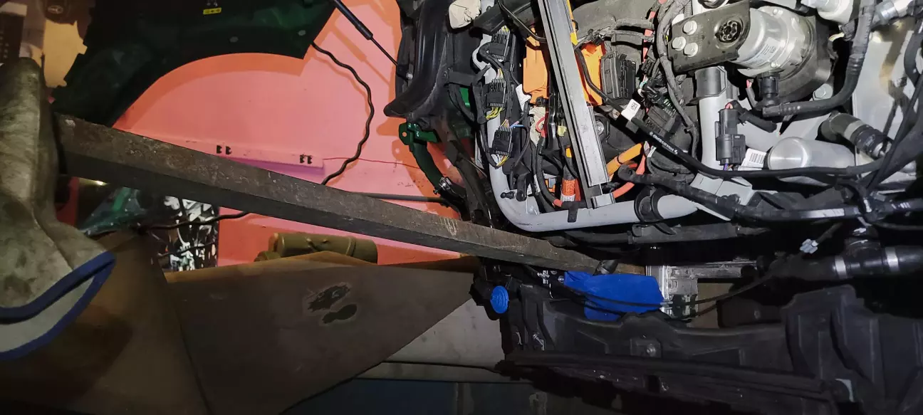Фіксується він на 4 здоровенних болти, а тримає всього лиш радіатор і нижню губу бамперу. Тому було прийнято рішення делікатного масажу двометровим кутиком. Читачам пропонується на цьому моменті провести гімнастику шиї 😁