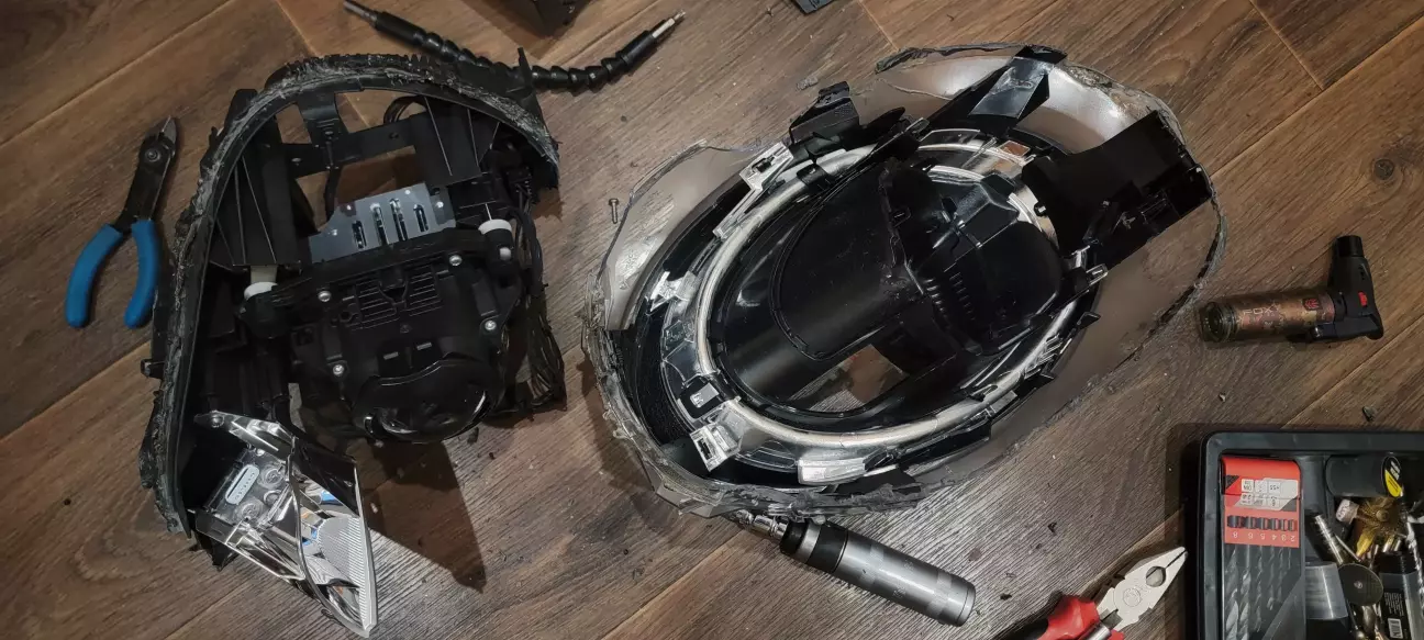 В процес були залучені дремель, турбозапальничка, викрутка і кусачки. В корпусі залишається сама лінза, блоки, проводка, а в склі - маска, яку треба обережно прогрівши відокремити.