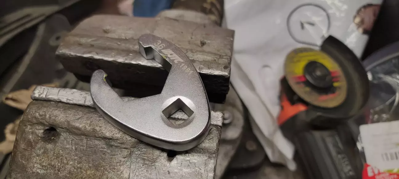 Для її зняття потрібна чергова спецприблуда BMW 83302287009, але на картринці в тісі був загадковий напис SW36. Підозріло схоже на Socket Wrench 36, ні? А платити 50 доларів за ключик на 36 мене б задушила жаба. Такі насадки під стандартний 1\2" продаються і по 500 грн, але є нюанс. І болгарка на фото - саме цей нюанс 😀Треба заважаючі частинки на кінцях підпилити.