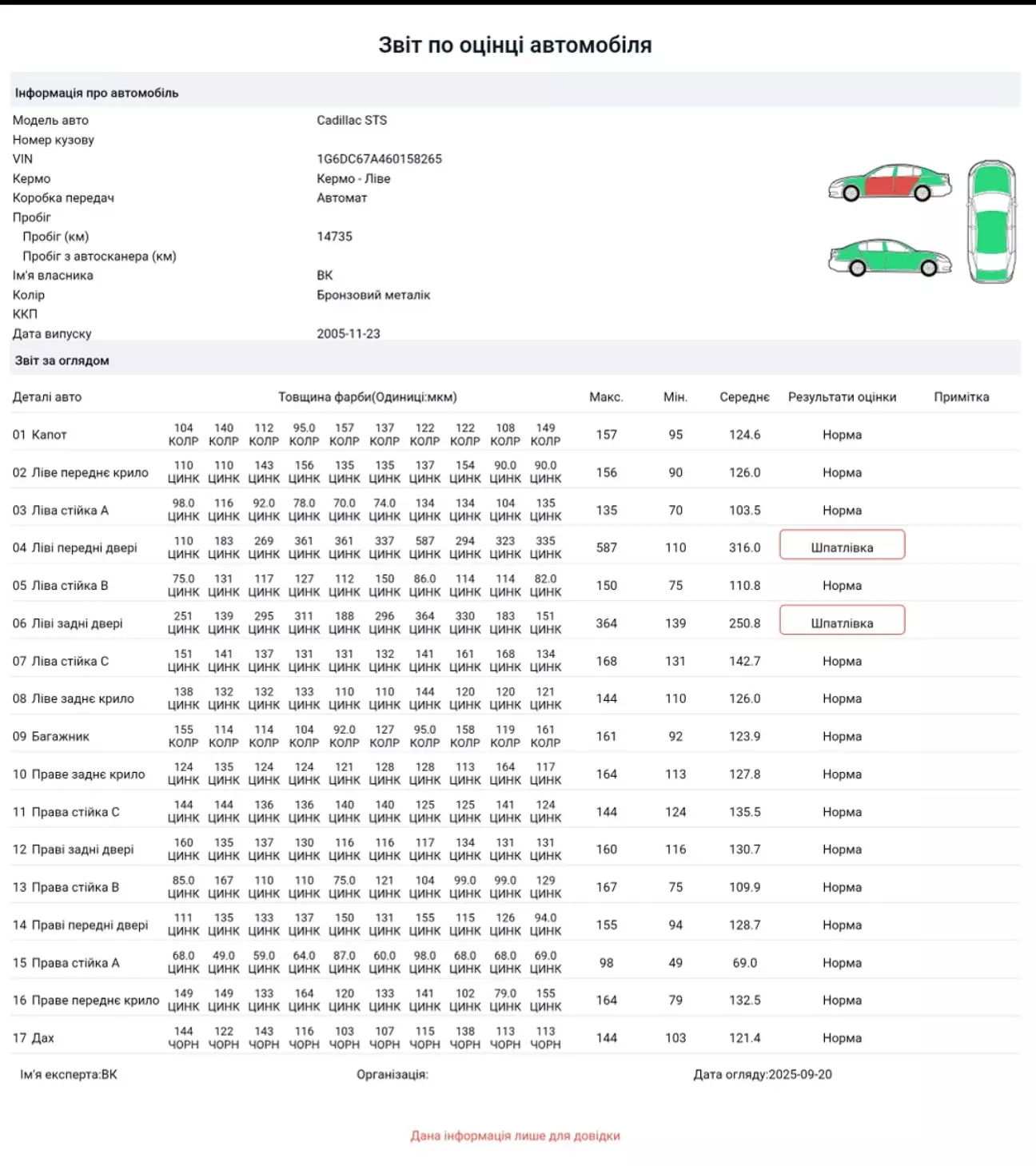 Перевірив машину ним, виявилось, що є два фарбованих елементи - обидві ліві двері. Всі інші кузовні елементи, включаючи стійки, в заводських значеннях. Думаю, що подряпали по дотичній, бо найбільше шпатлівки на водійських дверцятах, трохи нижче ручки відкривання дверей і потім шпатлівка продовжується на початку задніх дверей приблизно на тому ж рівні. Вся інша площа дверей, як передніх так і задніх, просто під подвійним шаром фарби. Плюс всі вікна рідні і їх дати випуску підходять під дату випуску самої машини (листопад 2005):
