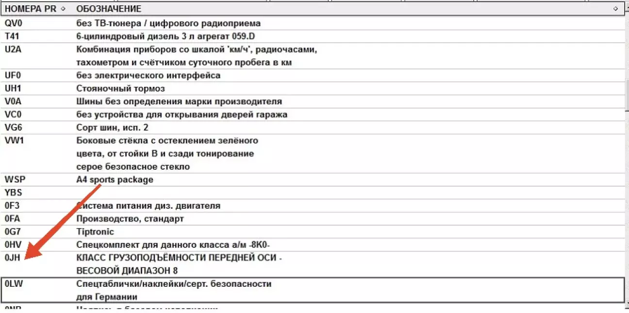 0JH — весовой класс передней оси 854-885 кг