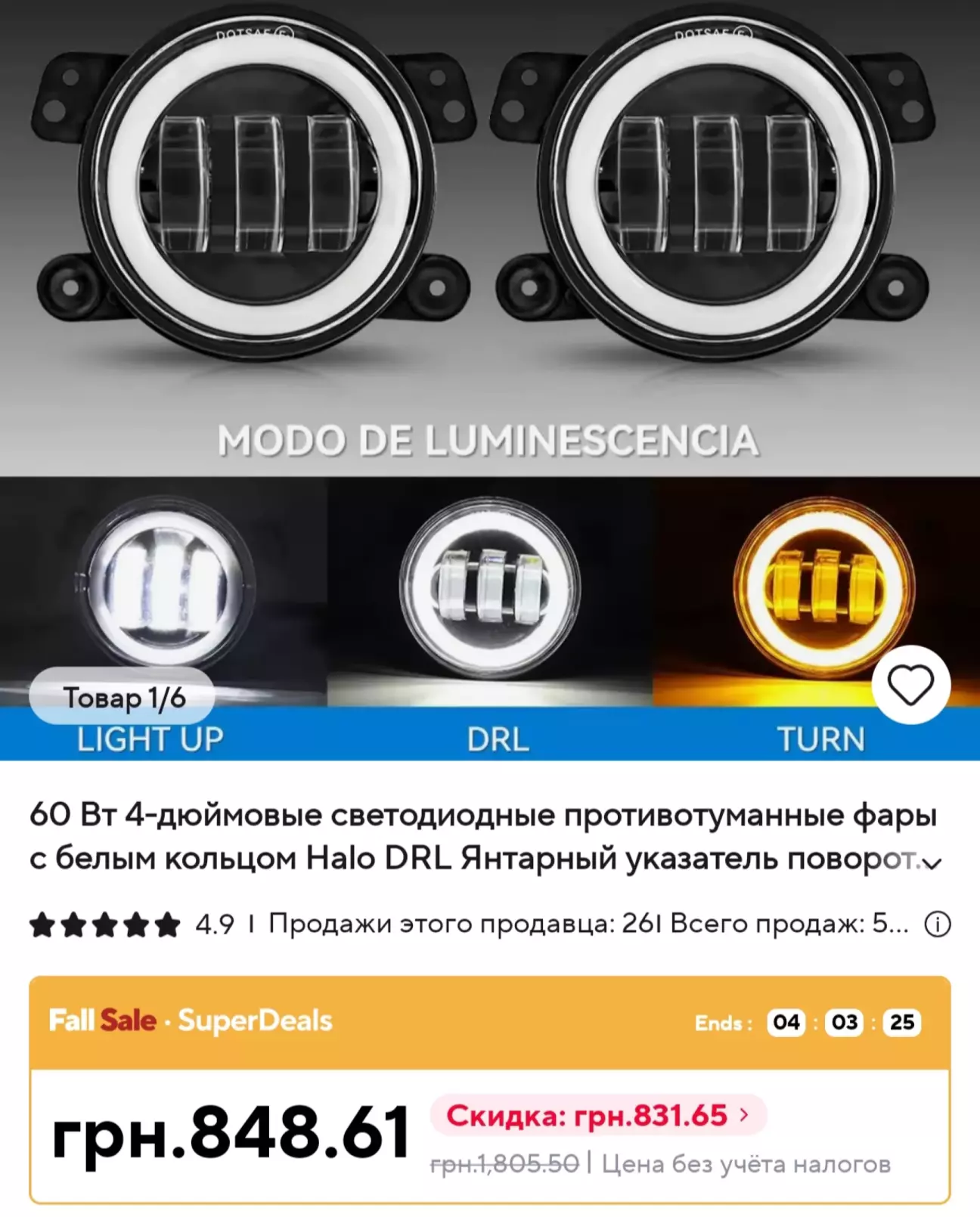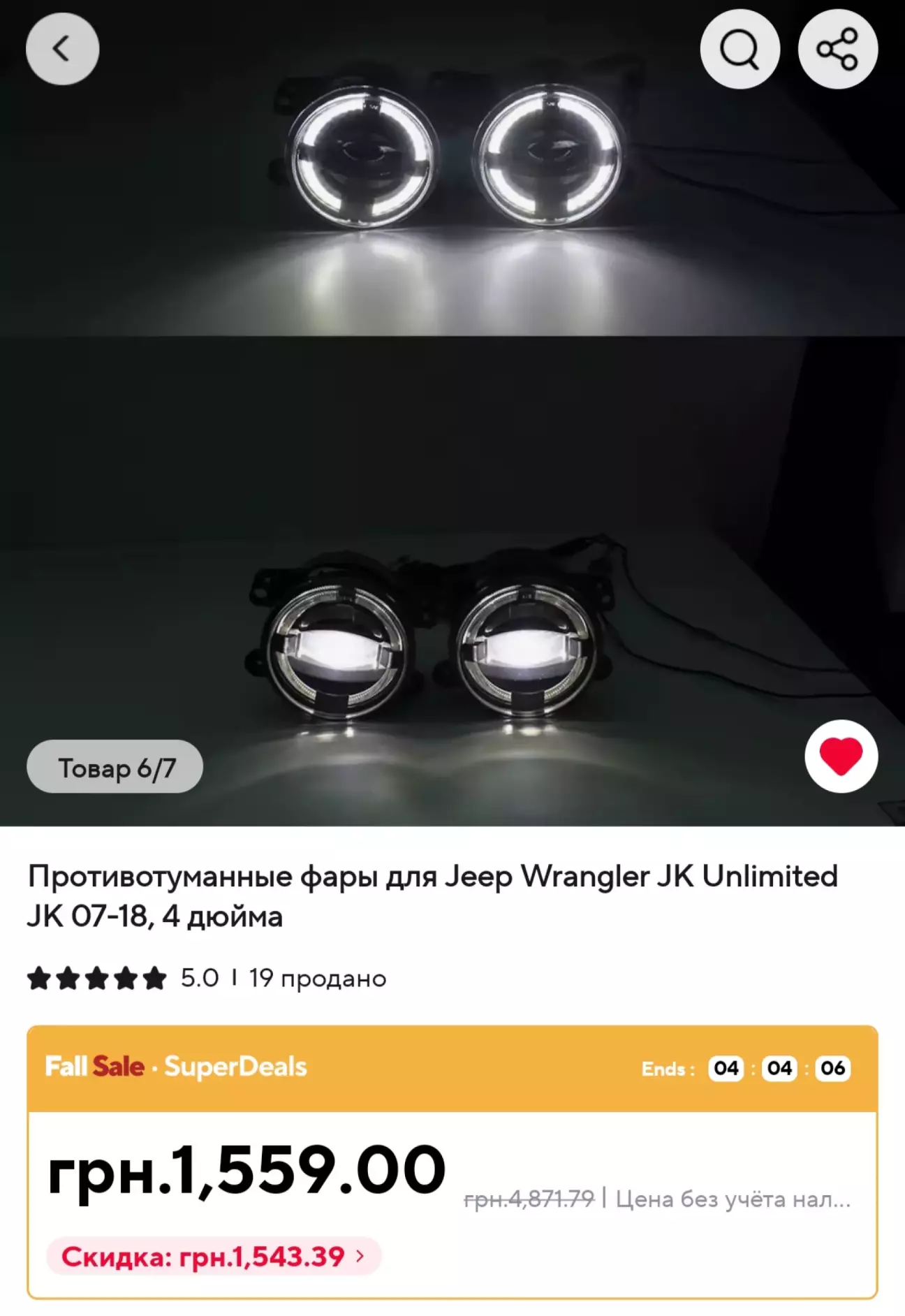 На багатьох протитуманках в описі було написано, що вони підходять практично до всіх автомобілів, і я чомусь вирішив, що всі протитуманки одного розміру, універсальні. Тут я натрапив на картку товару протитуманок для Jeep, на які була знижка, а ще в них були повторювачі поворотів, в результаті їх і замовив.