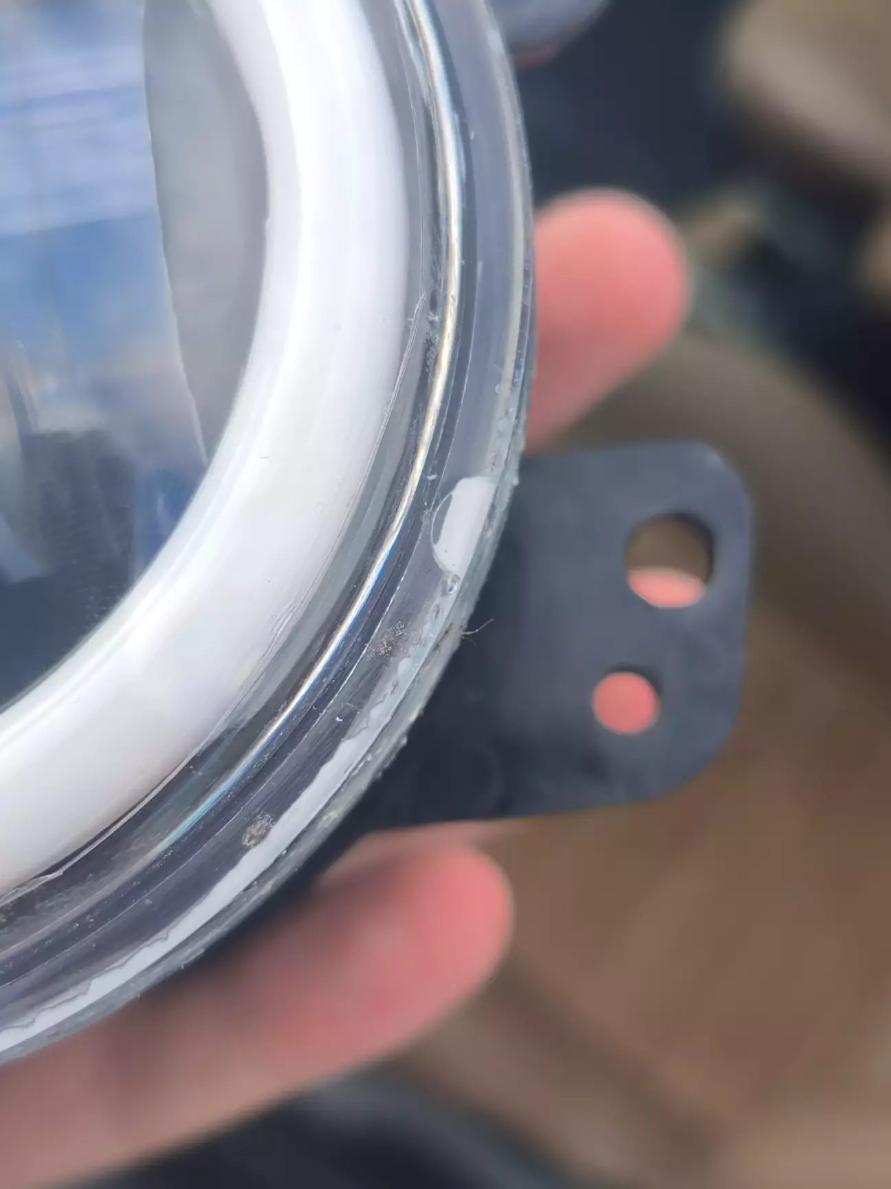 Після прибуття протитуманних фар першим ділом промазав стик скла і корпусу ПТФ герметиком, на фото видно, що виріб не зовсім герметичний і видно, як герметик заповнив порожнечі. Через пару днів замовив протитуманні фари, щоб їх «закатали» в плівку.